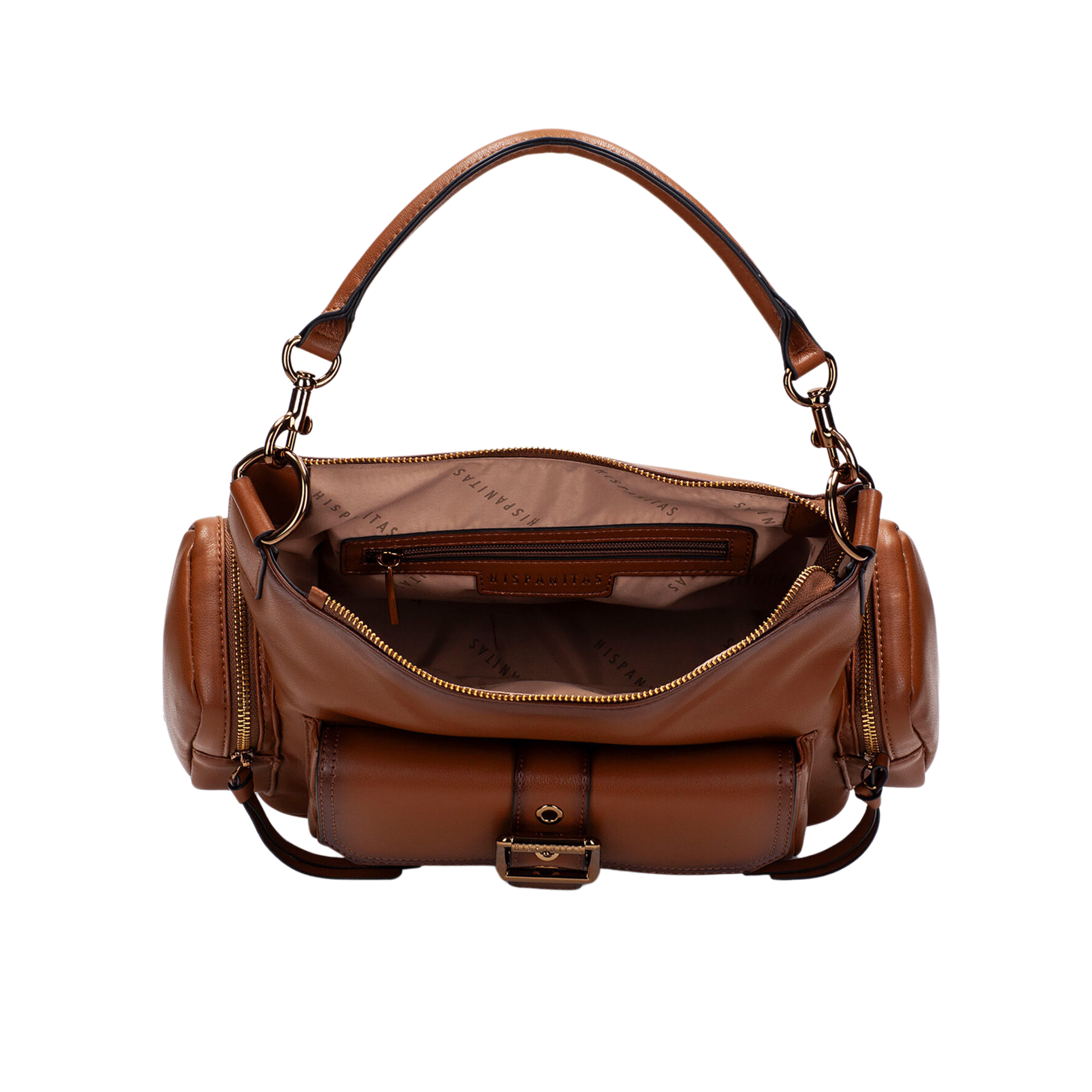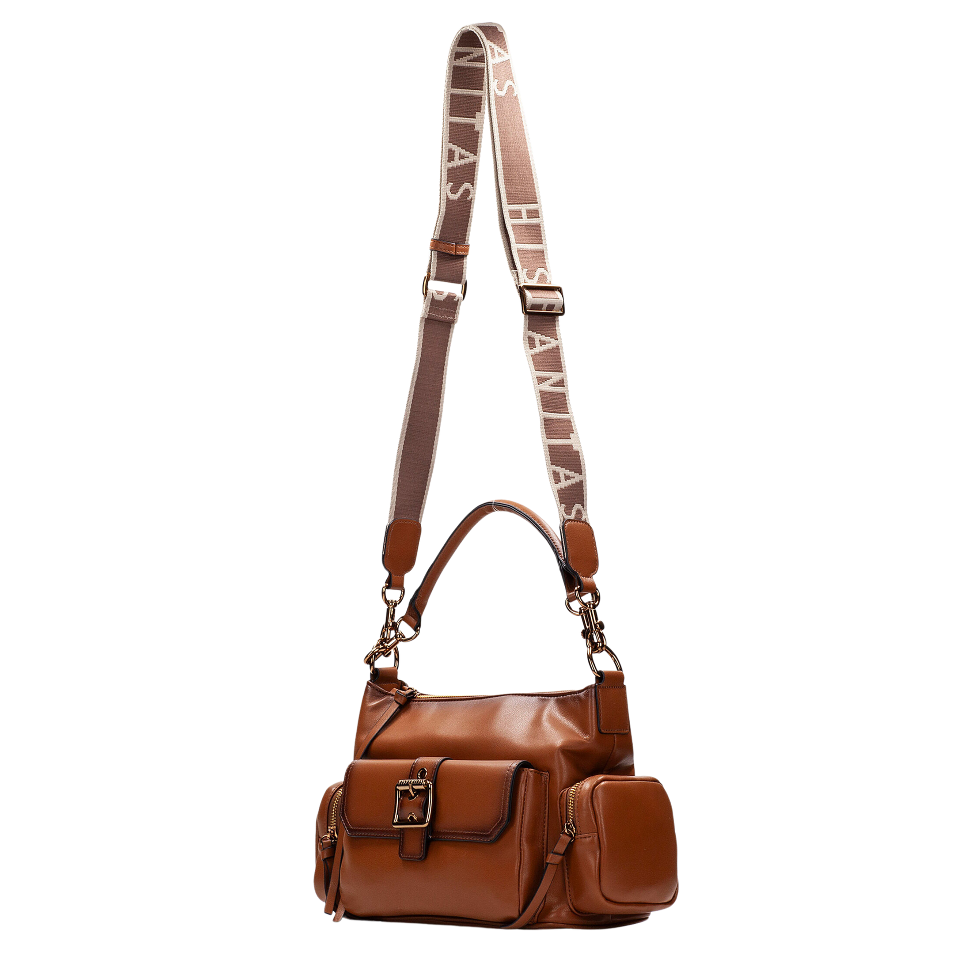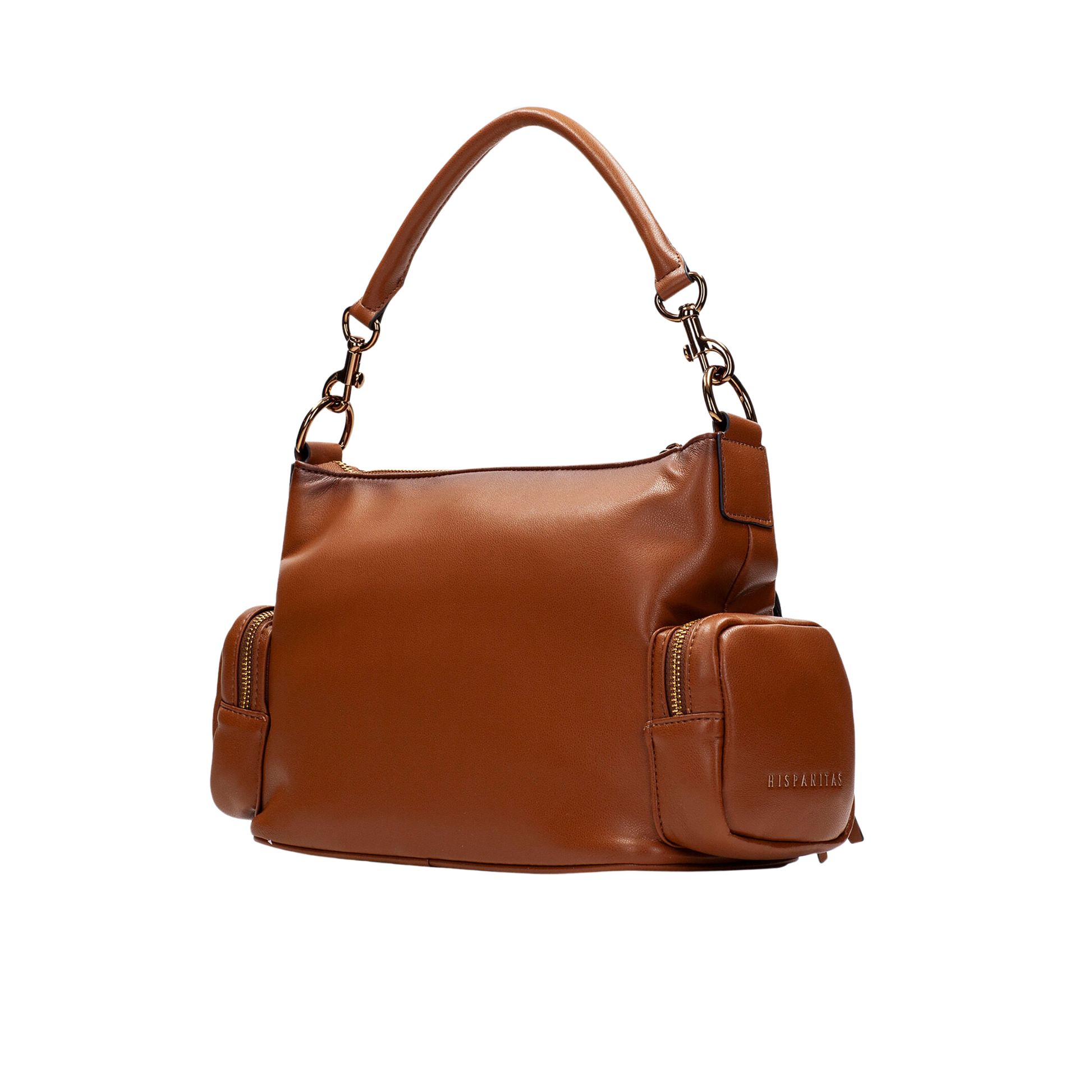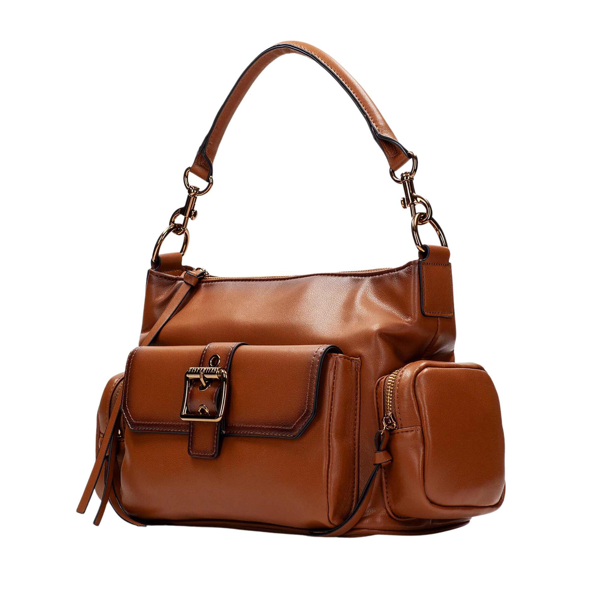 Bolso de hombro con bolsillos exteriores y cierre de cremallera.br /> Hebilla decorativa en el bolsillo central.