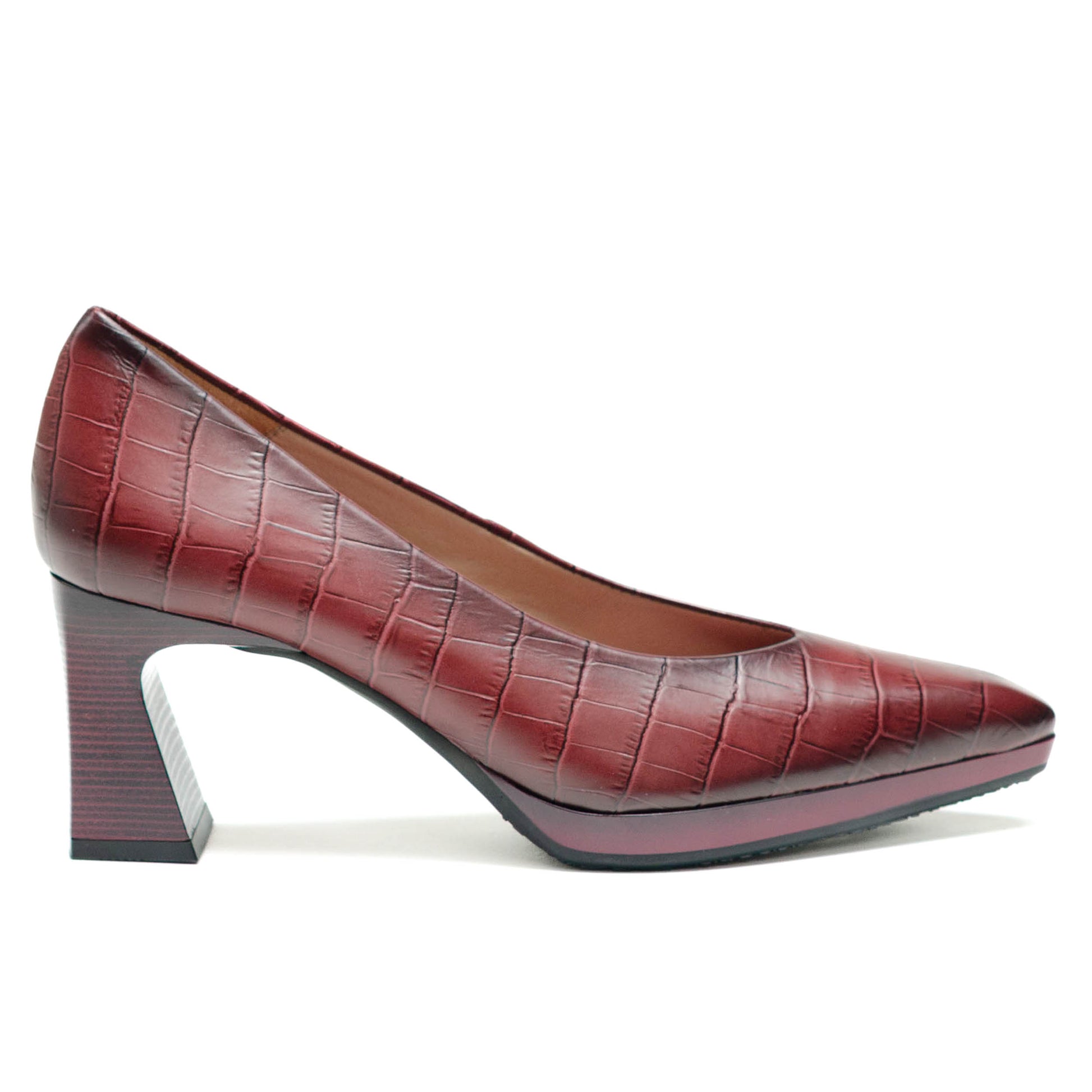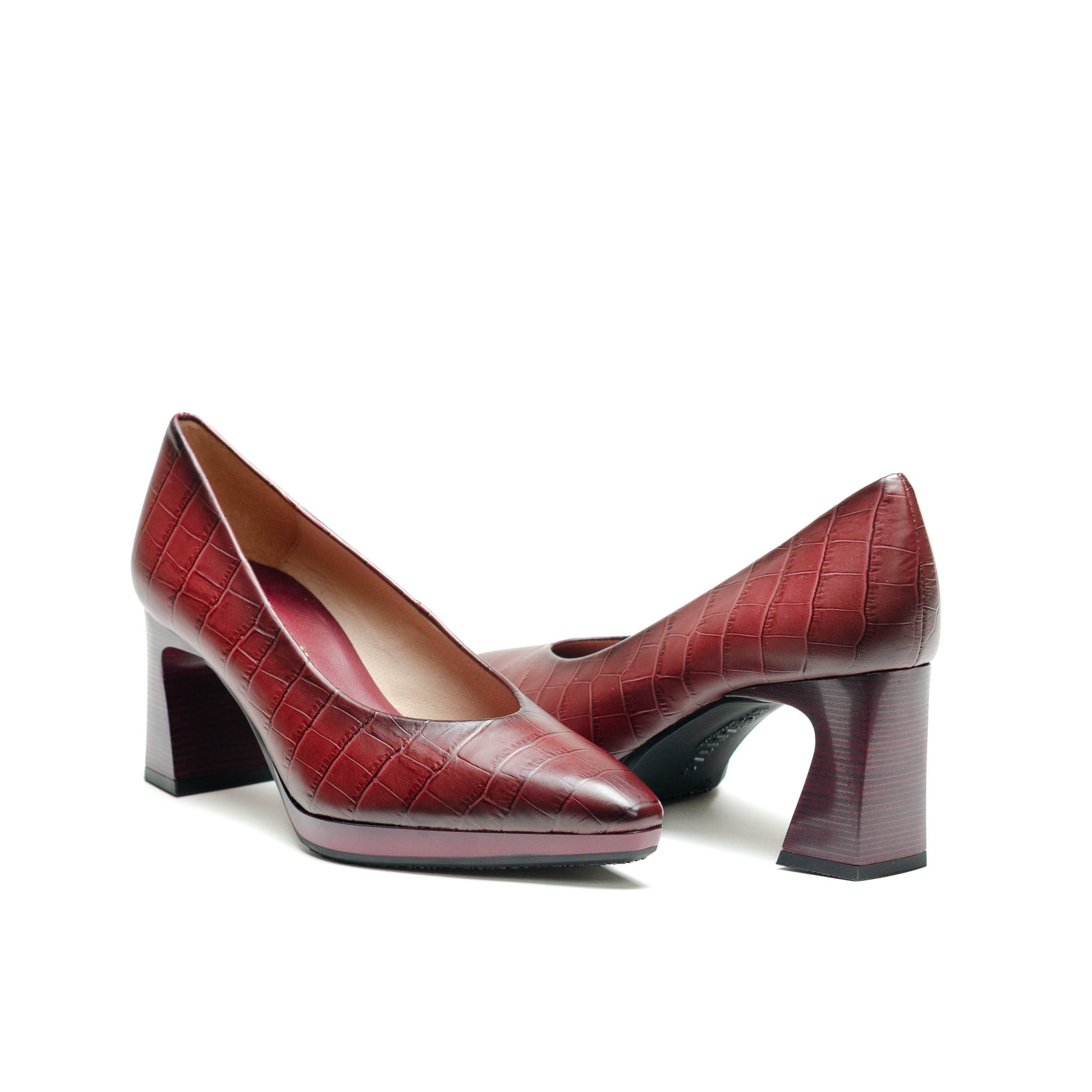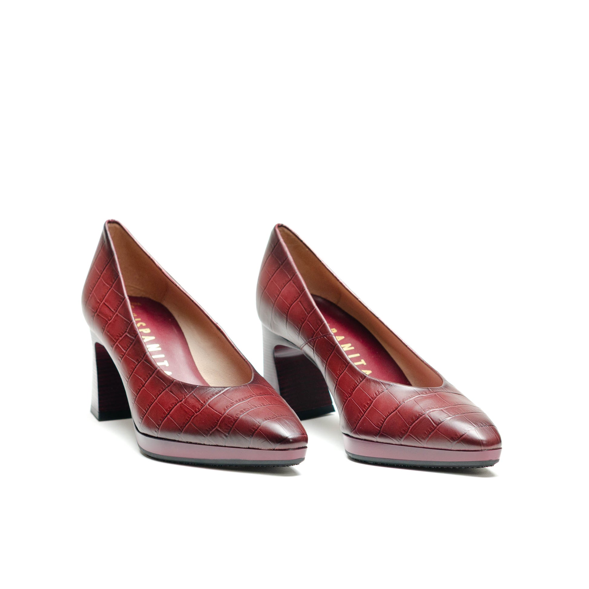 Hispanitas Escorpio, Salón de punta afilada. Ligera plataforma de 1 cm y tacón geométrico cómodo con acabado madera.