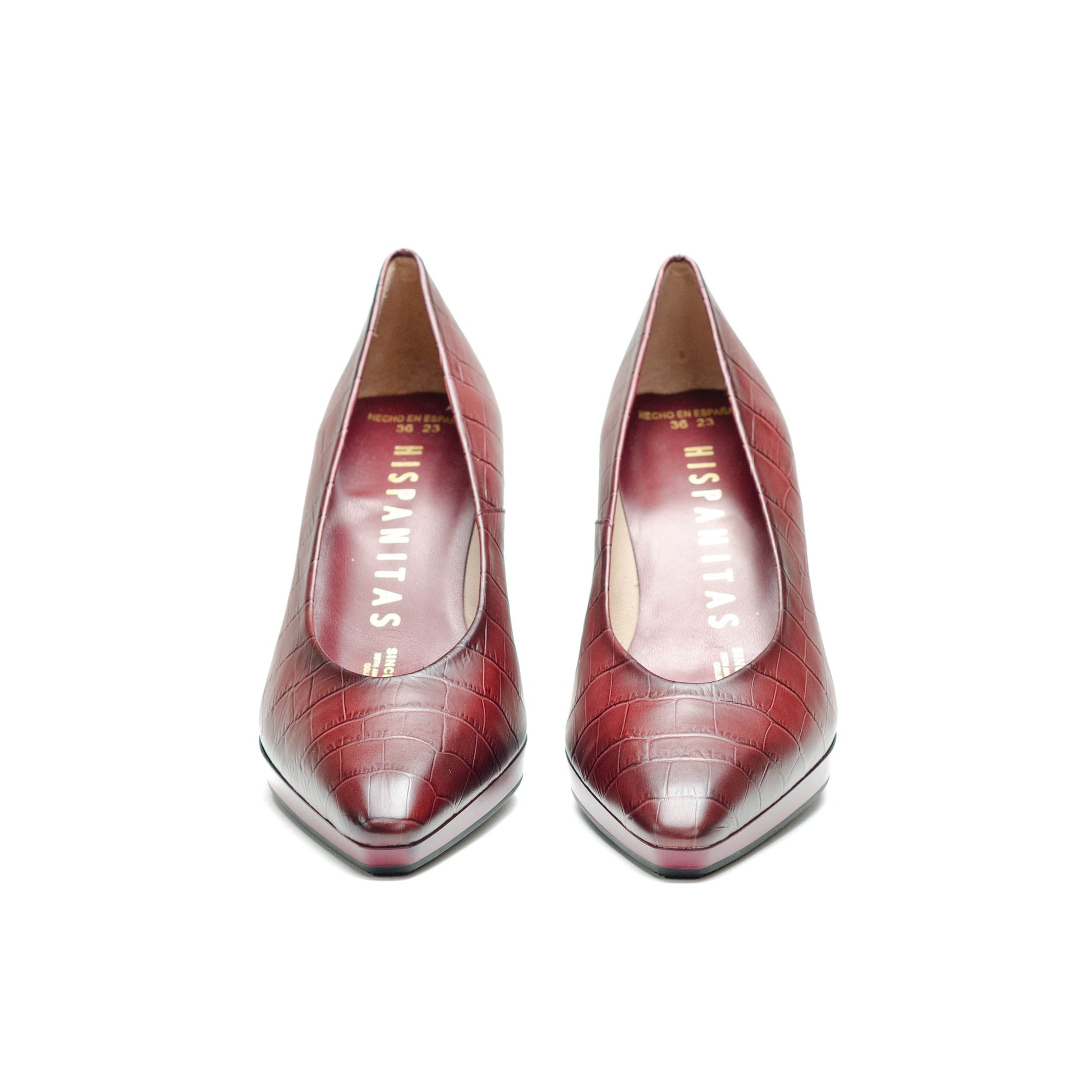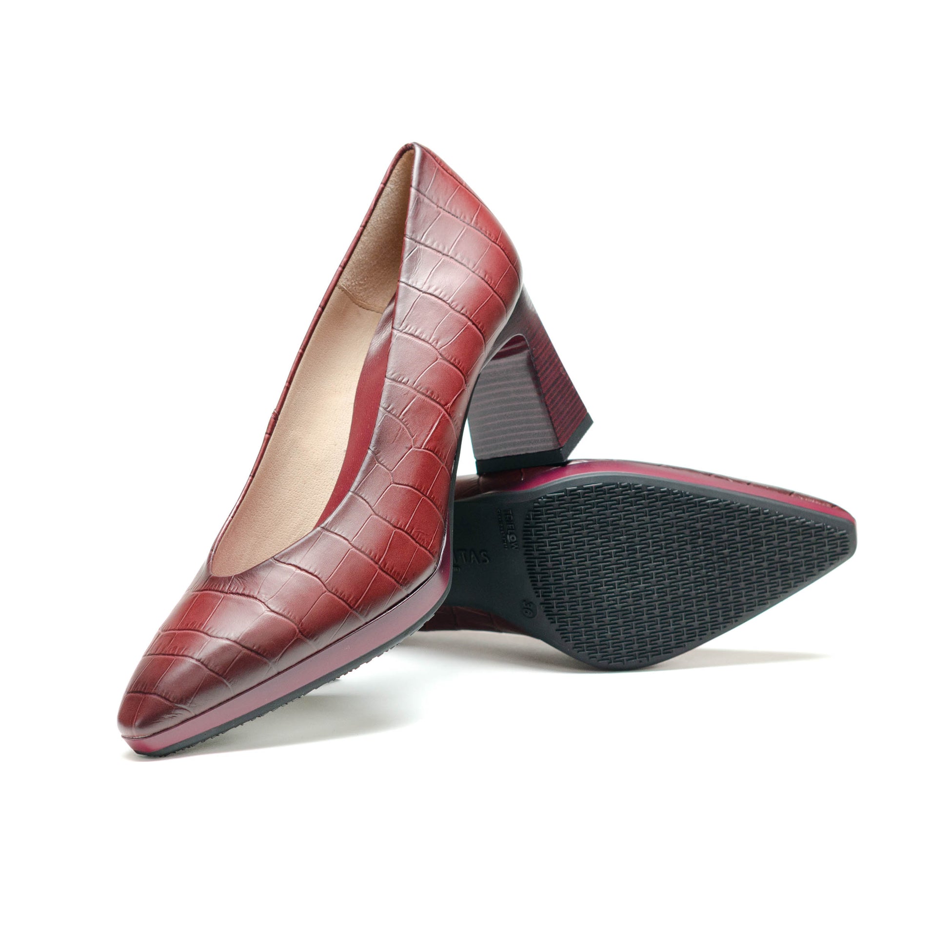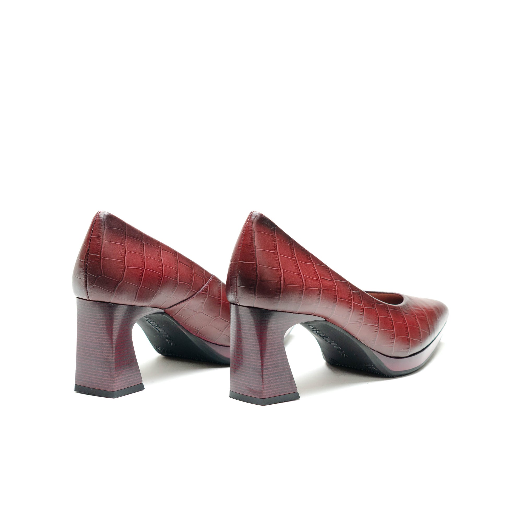 Hispanitas Escorpio, Salón de punta afilada. Ligera plataforma de 1 cm y tacón geométrico cómodo con acabado madera.