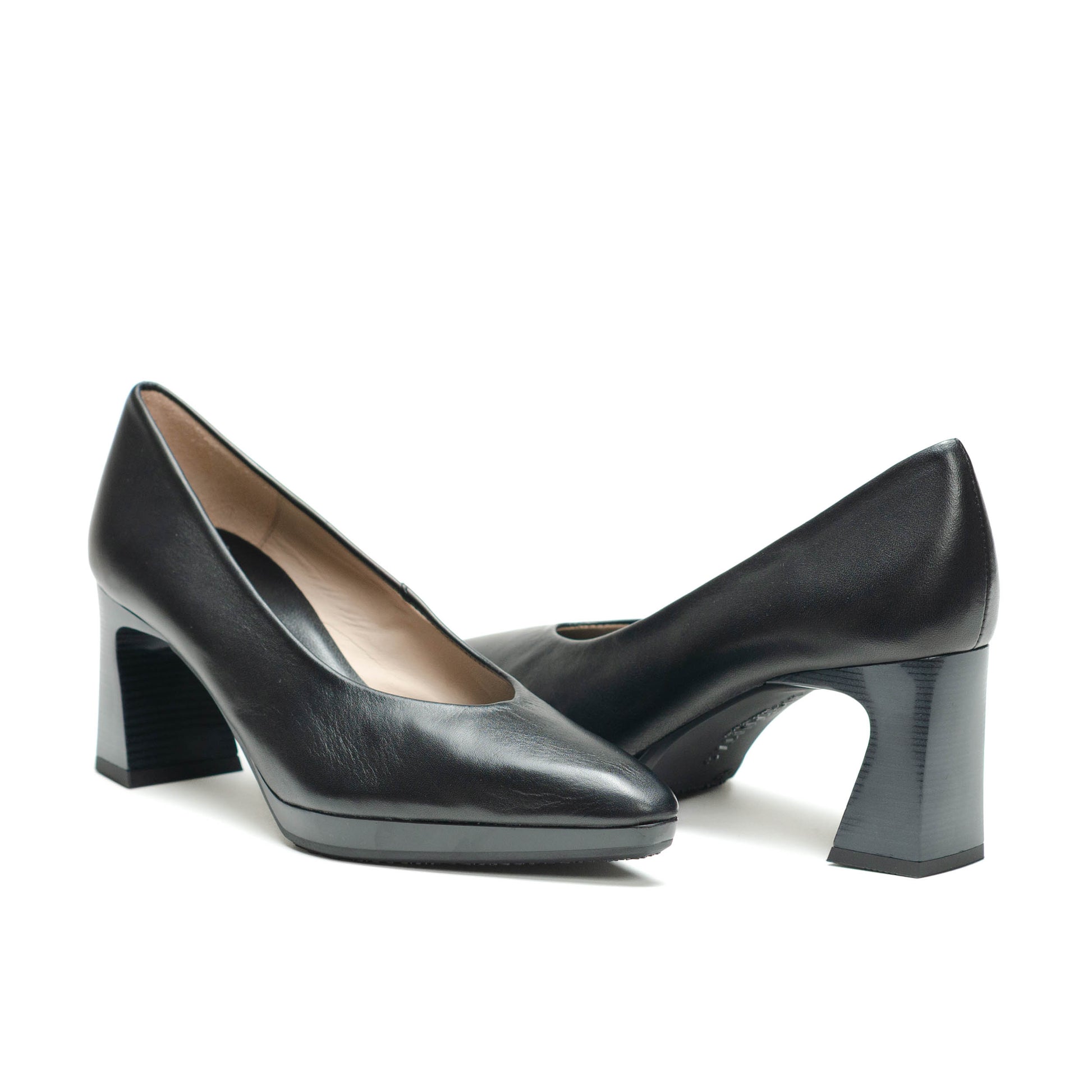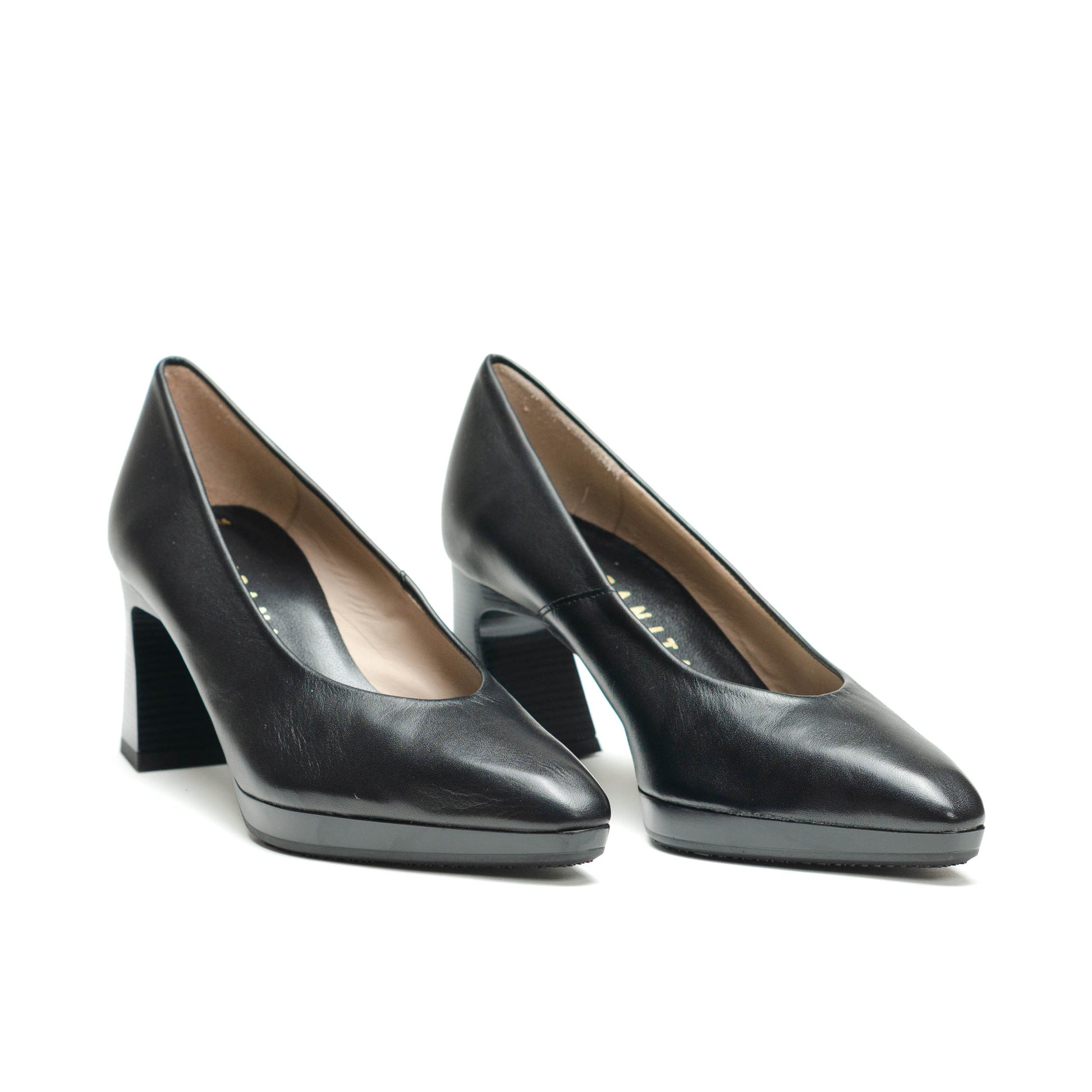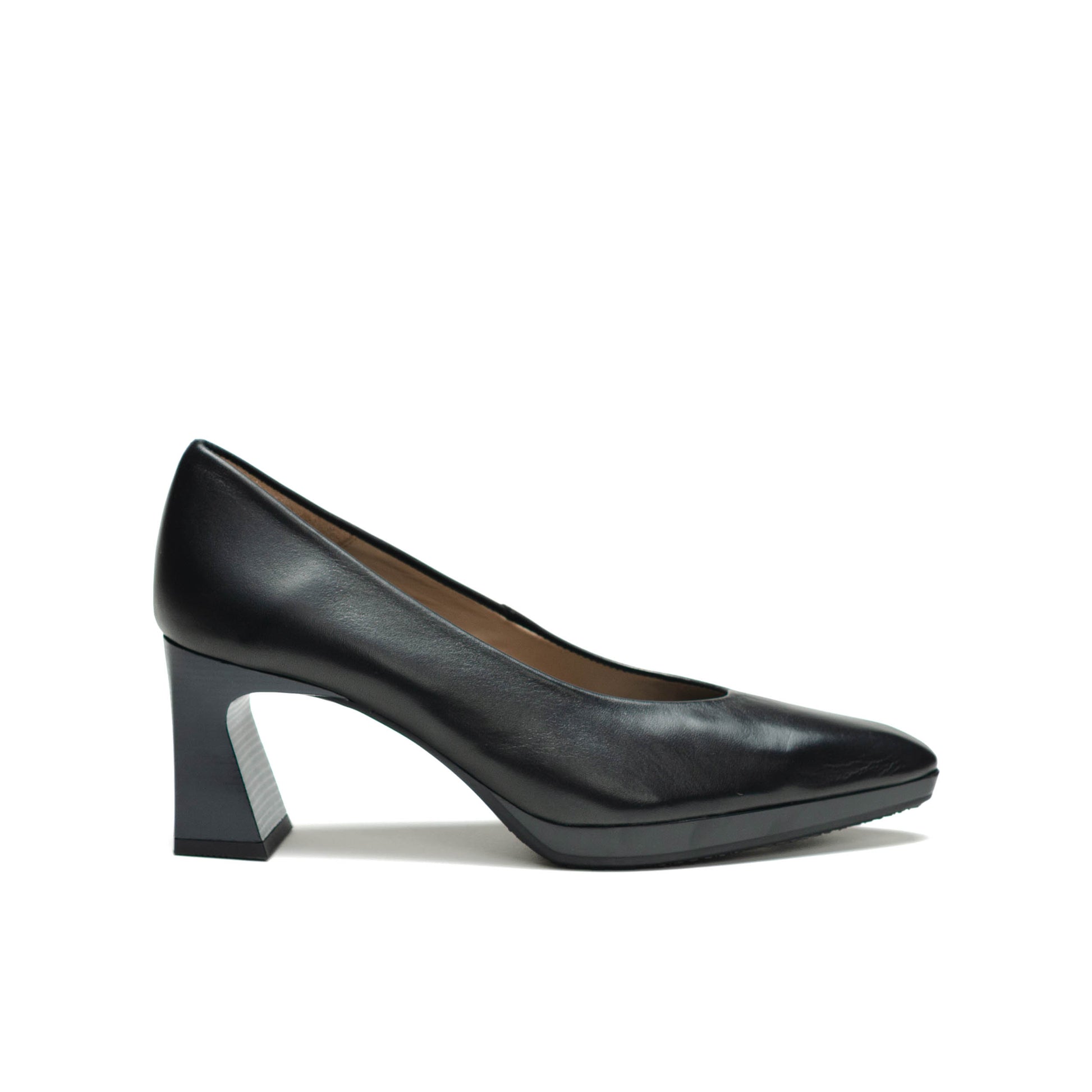 Hispanitas Escorpio, Salón de punta afilada. Ligera plataforma de 1 cm y tacón geométrico cómodo con acabado madera.