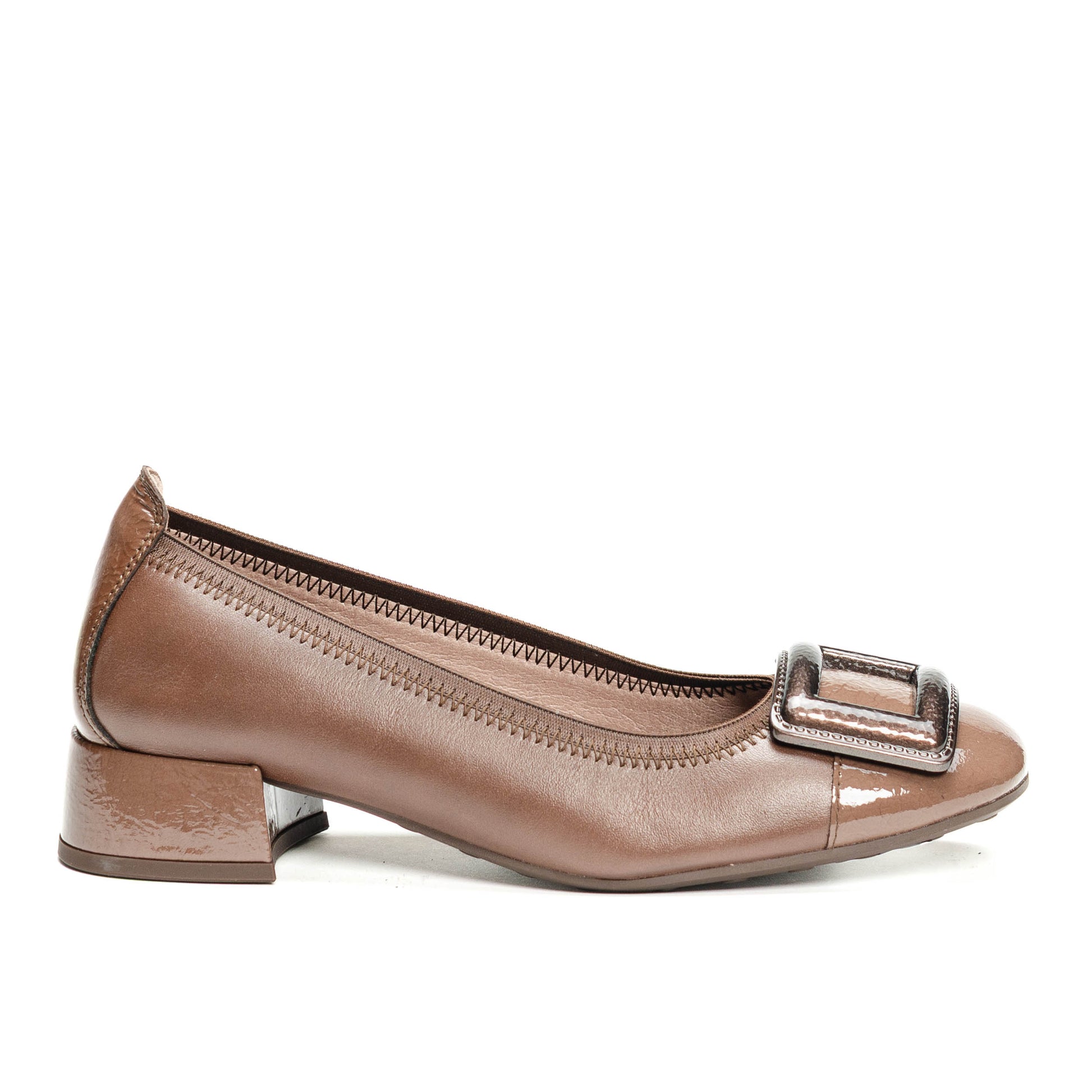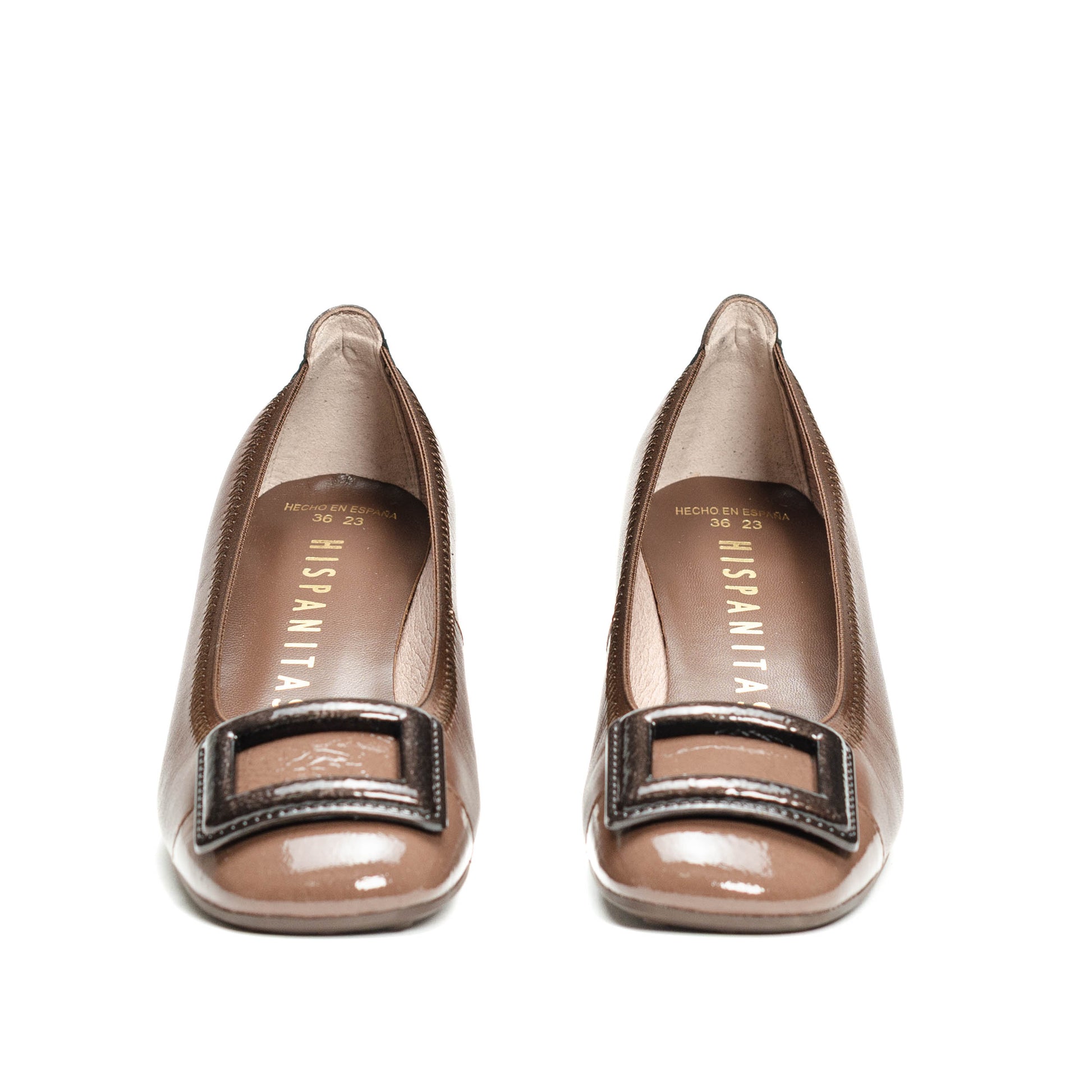 Hispanitas Escorpio, Zapatilla color cafe de punta cuadrada con detalle de hebilla cuadrada en el empeine.