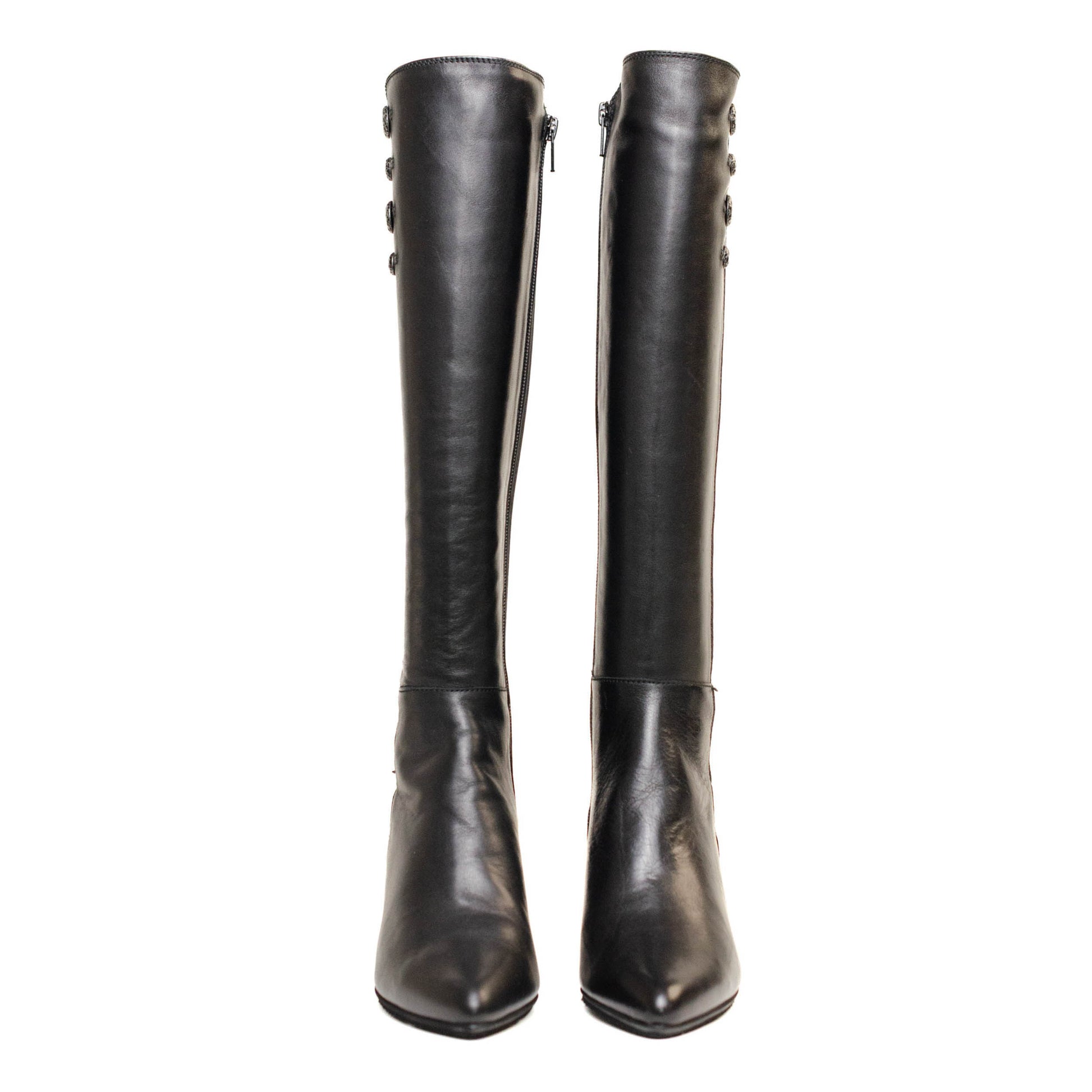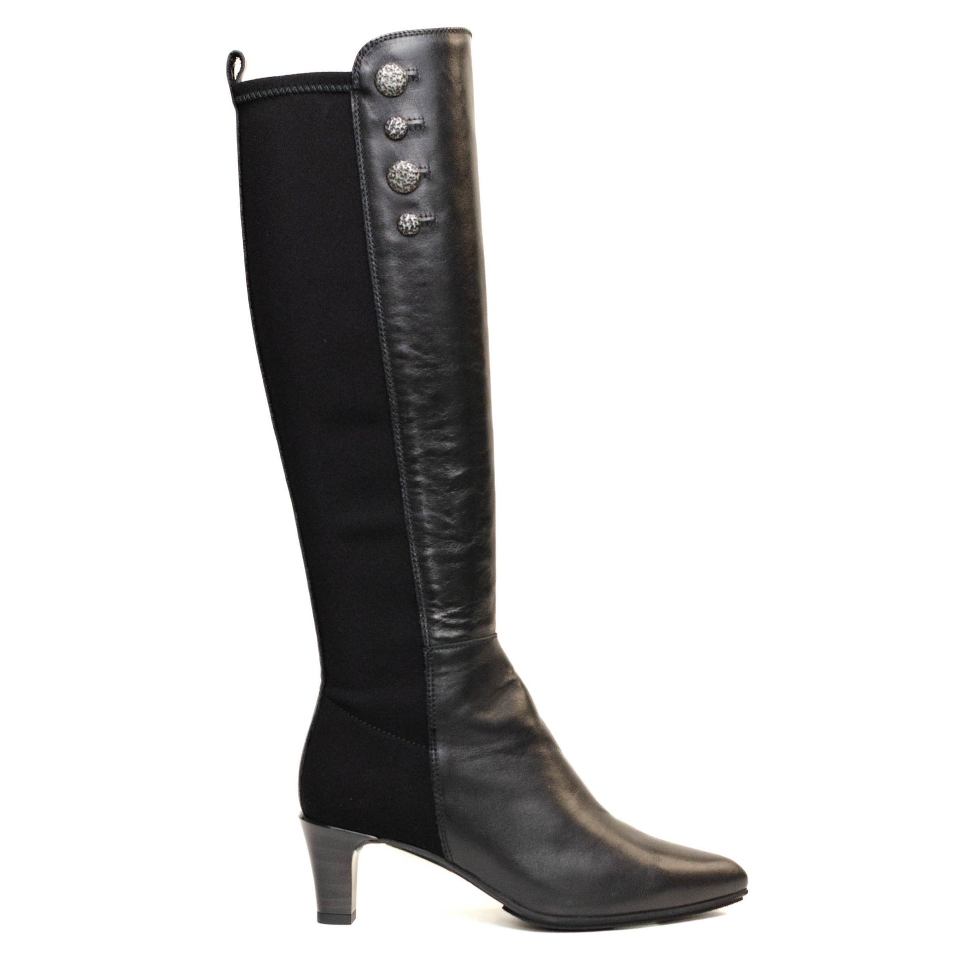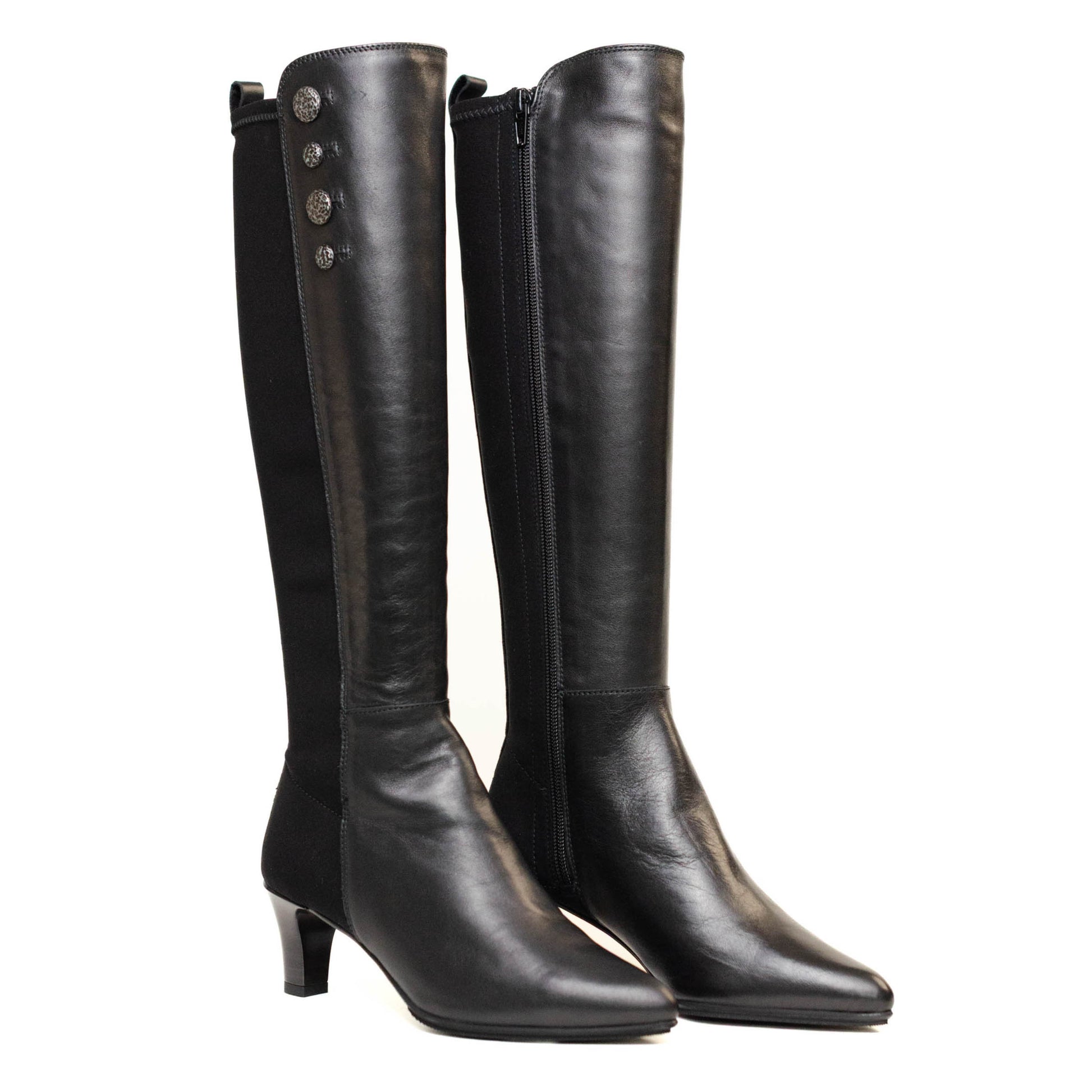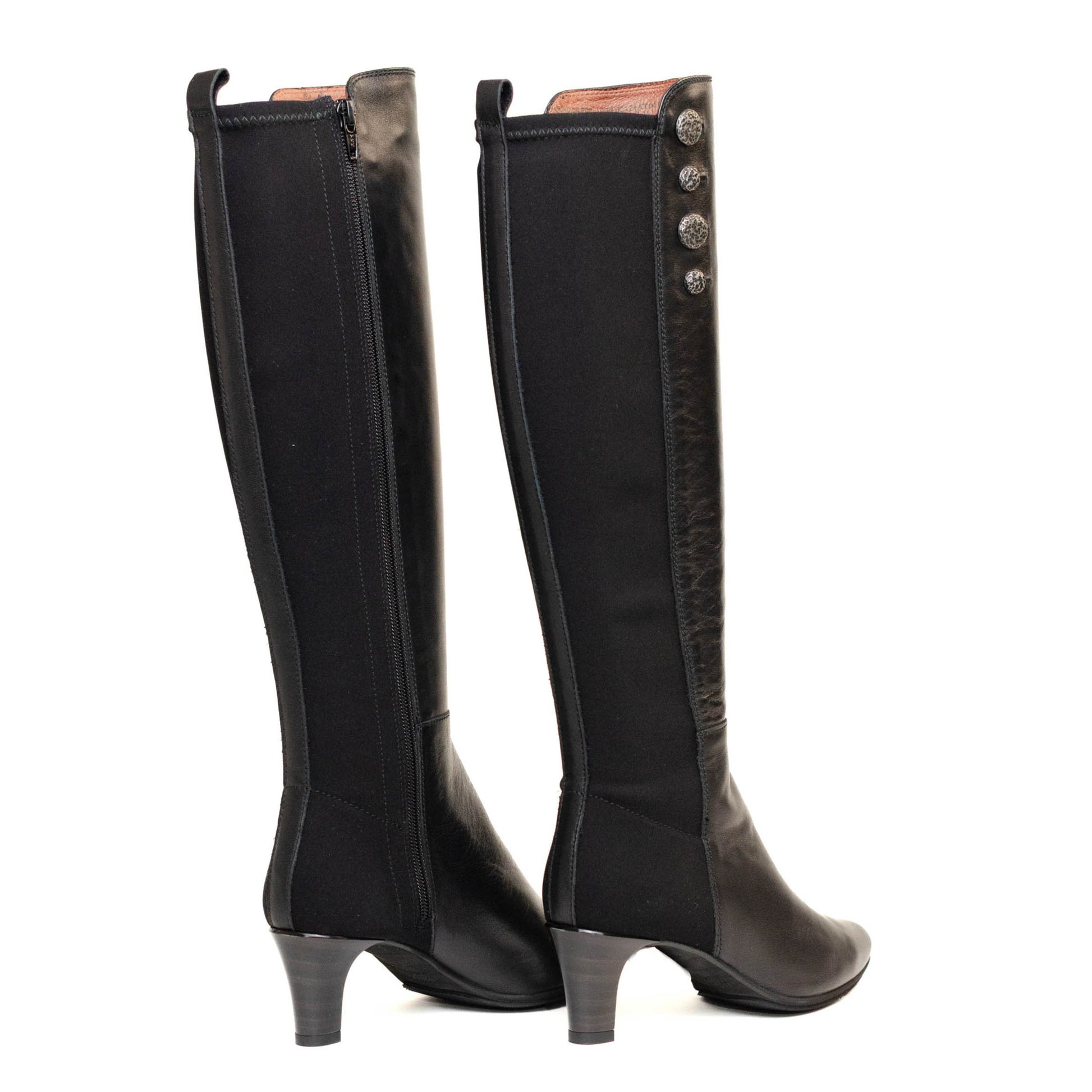 Hispanitas Escorpio, bota larga forrada enn piel lisa de color negro combinado con neopreno con terminación en punta con tacon cuadrado de 4 cm.