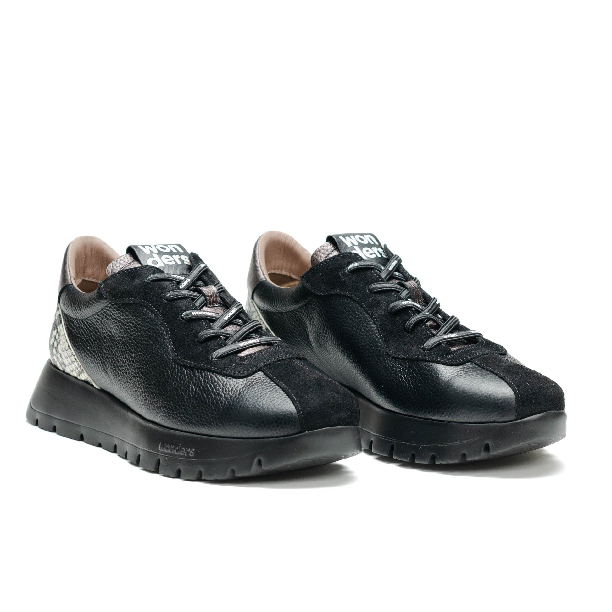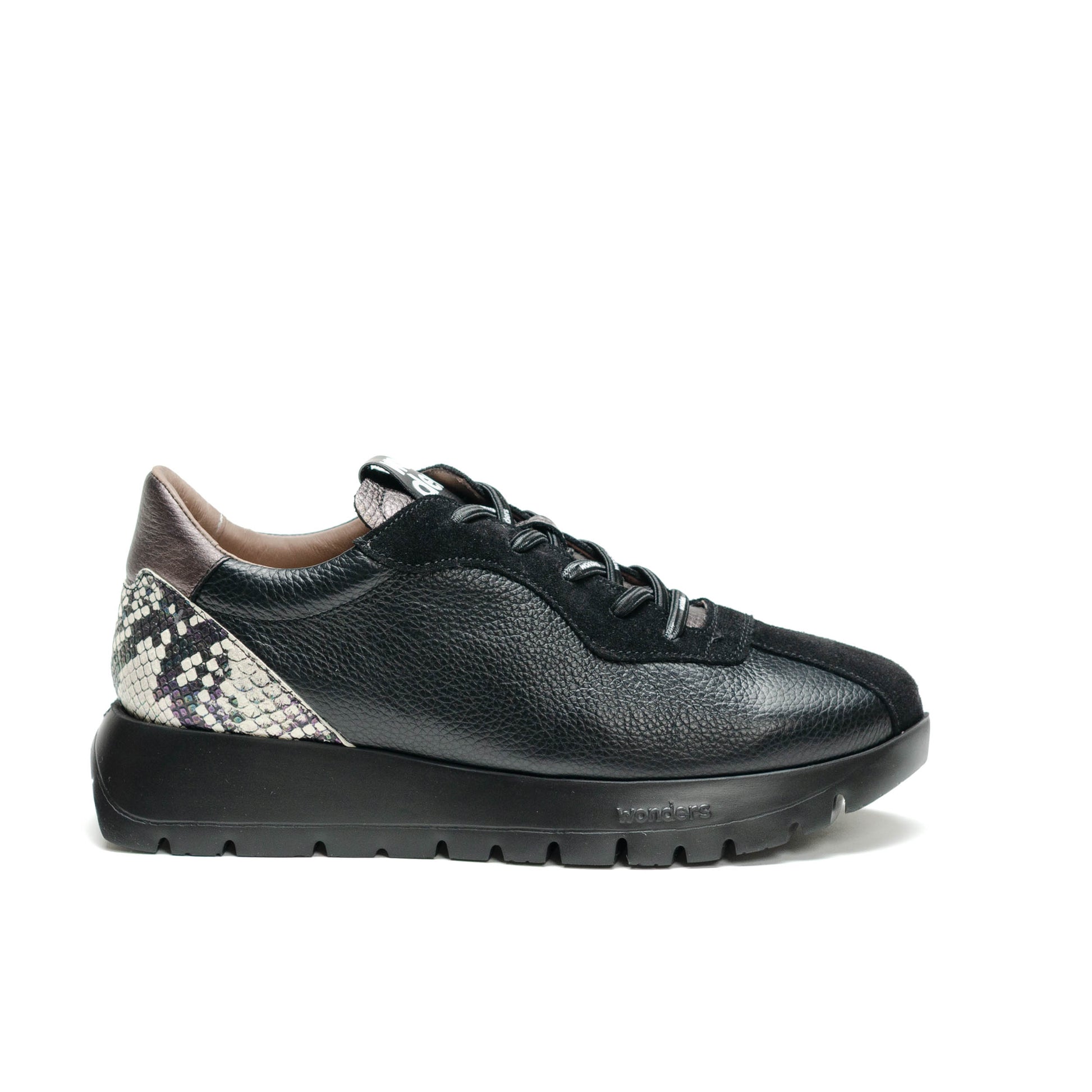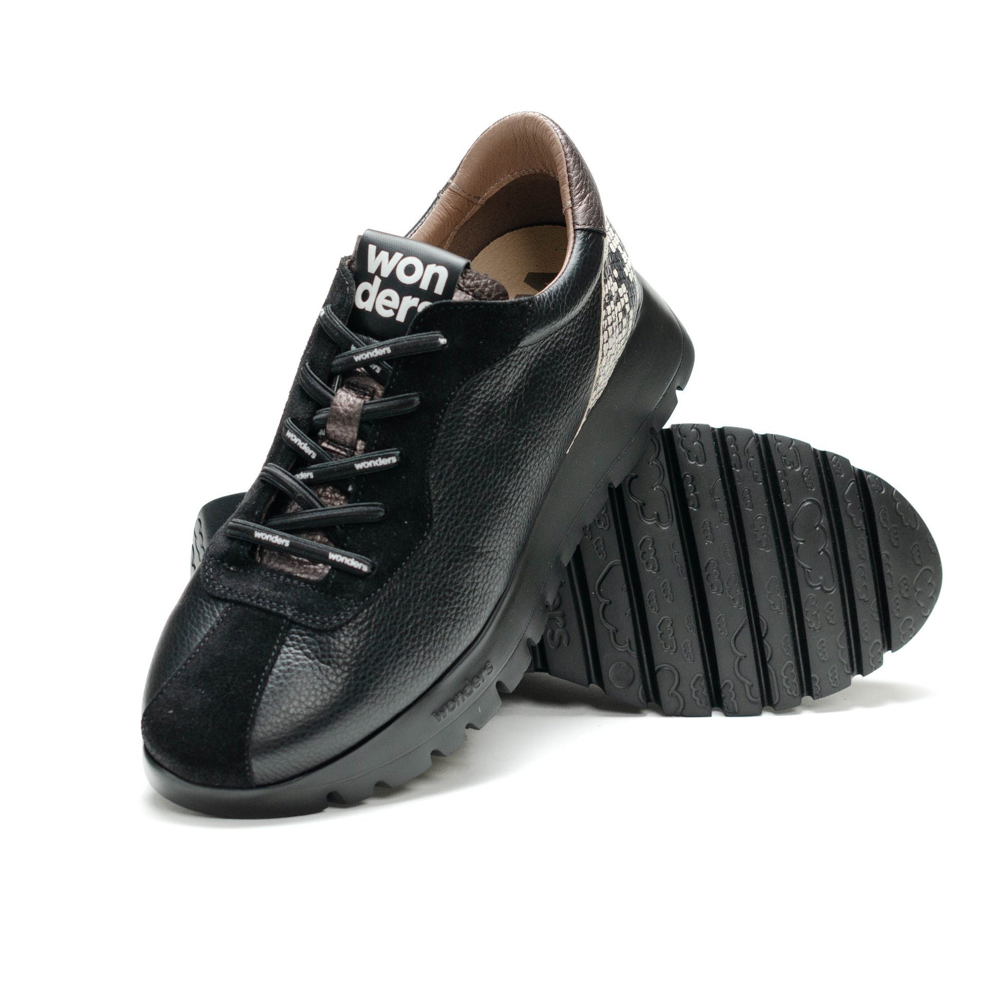 Wonders Escorpio, Tenis fabricados en combinación de materiales en tonos negro, metalicos y piel grabada reptil. Este modelo con diseño, cómodo y a la moda. Su ajuste es mediante cordones elásticos brandeados que aportan practicidad y estilo. Su suela, creada con tecnología WondersFly™ by XL EXTRALIGHT®, garantiza una ligereza excepcional y un confort extraordinario. Además, la plantilla interior extraíble de MemoryGel se adapta perfectamente al pie, proporcionando comodidad en cada paso. Prepárate para sentir la sensación #YesWeFly. Wonders apuesta por una fabricación responsable avalada por LEATHERWORKINGGROUP.