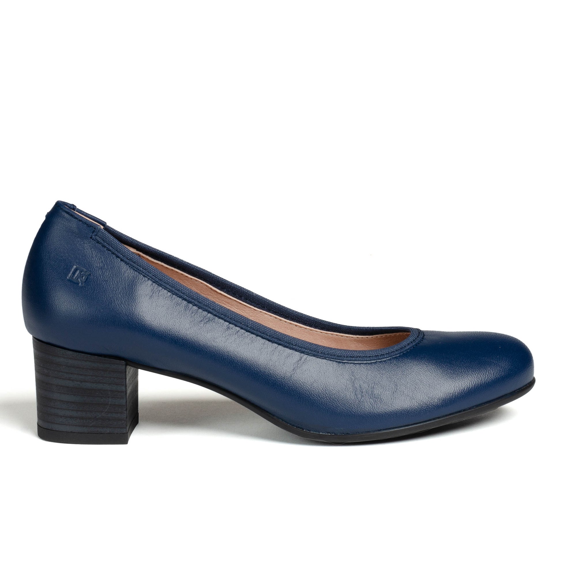 Dorking Escorpio, calzado de piel lisa azul. Su tacón medio, su escote cerrado redondo y los materiales con los que está fabricado, hacen de este modelo una opción segura. Un estilo arreglado pero casual a la vez.