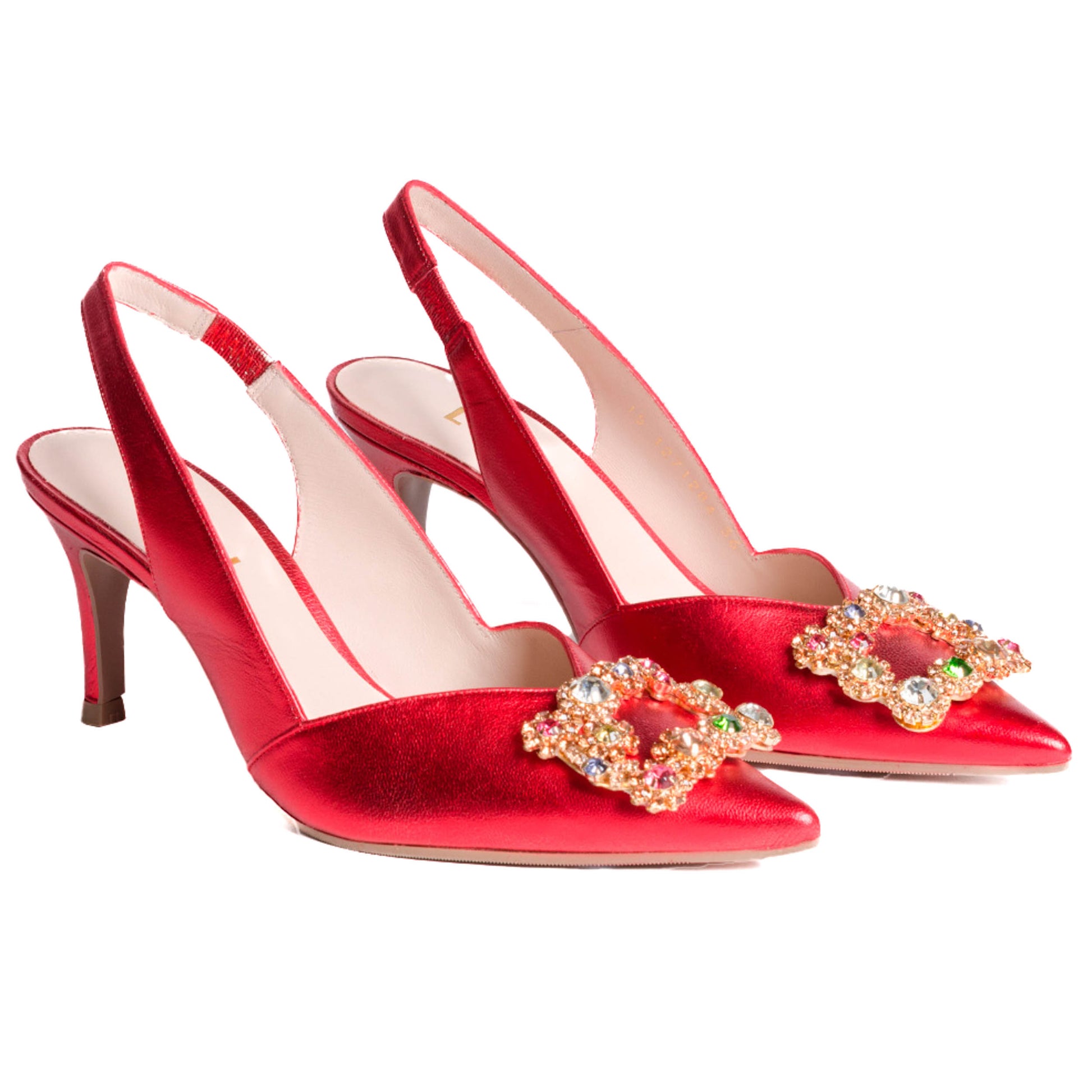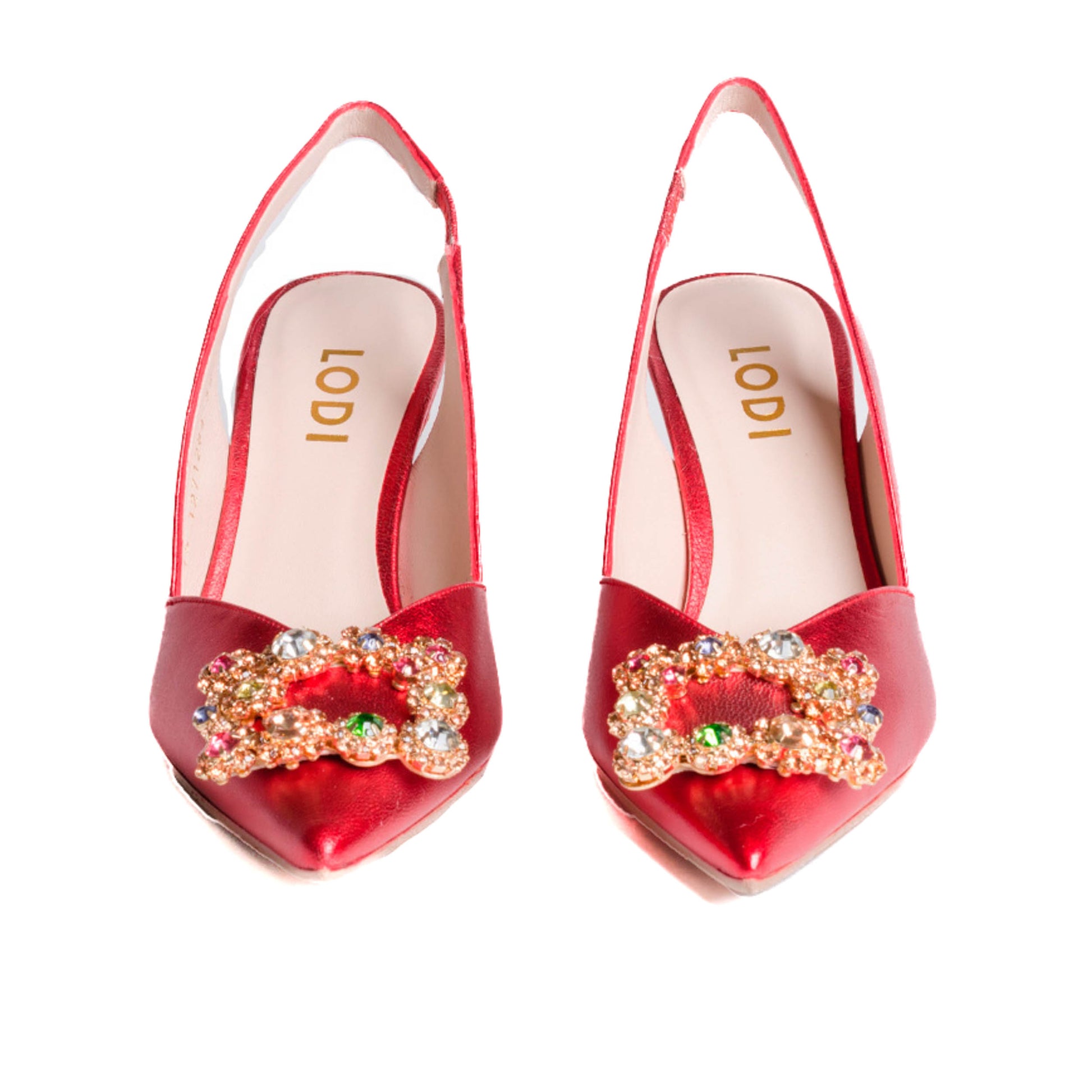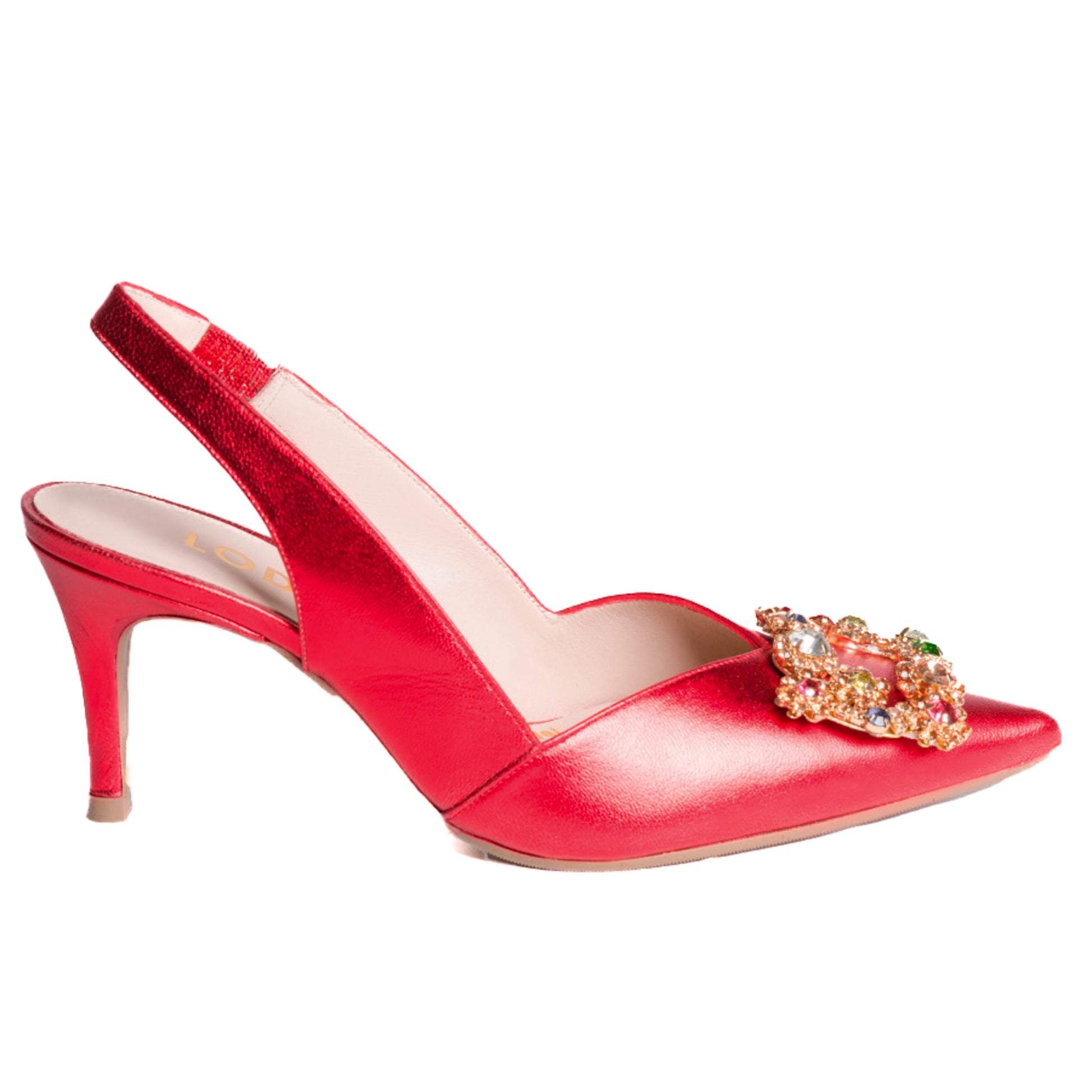 Lodi Escorpio, zapatilla destalonada ELANA en piel color rojo y detalle de pedrería. Un diseño confeccionado con tacón fino de 7.5 cm de altura forrado al tono. Lateral acabado en pico. Goma elástica lateral. Interior forrado en piel. Un salón muy especial que podrás combinar con cualquiera de tus looks. Incluye planta new gel para mayor comodidad en todas tus pisadas. Fabricado en España.