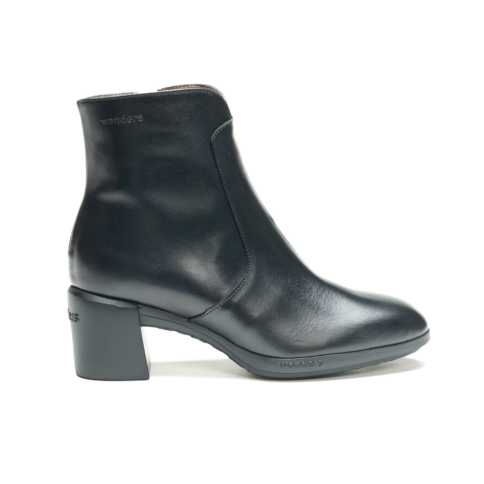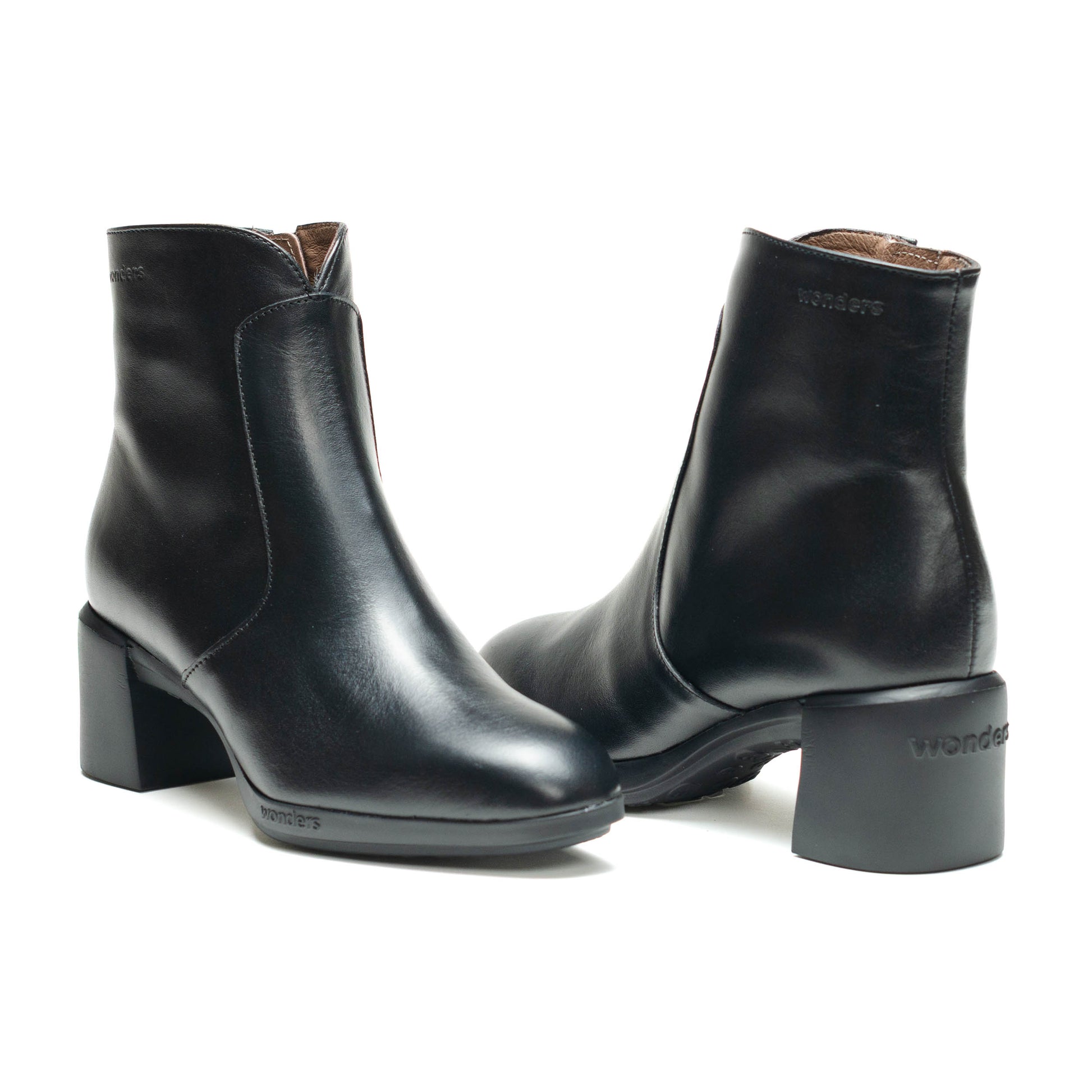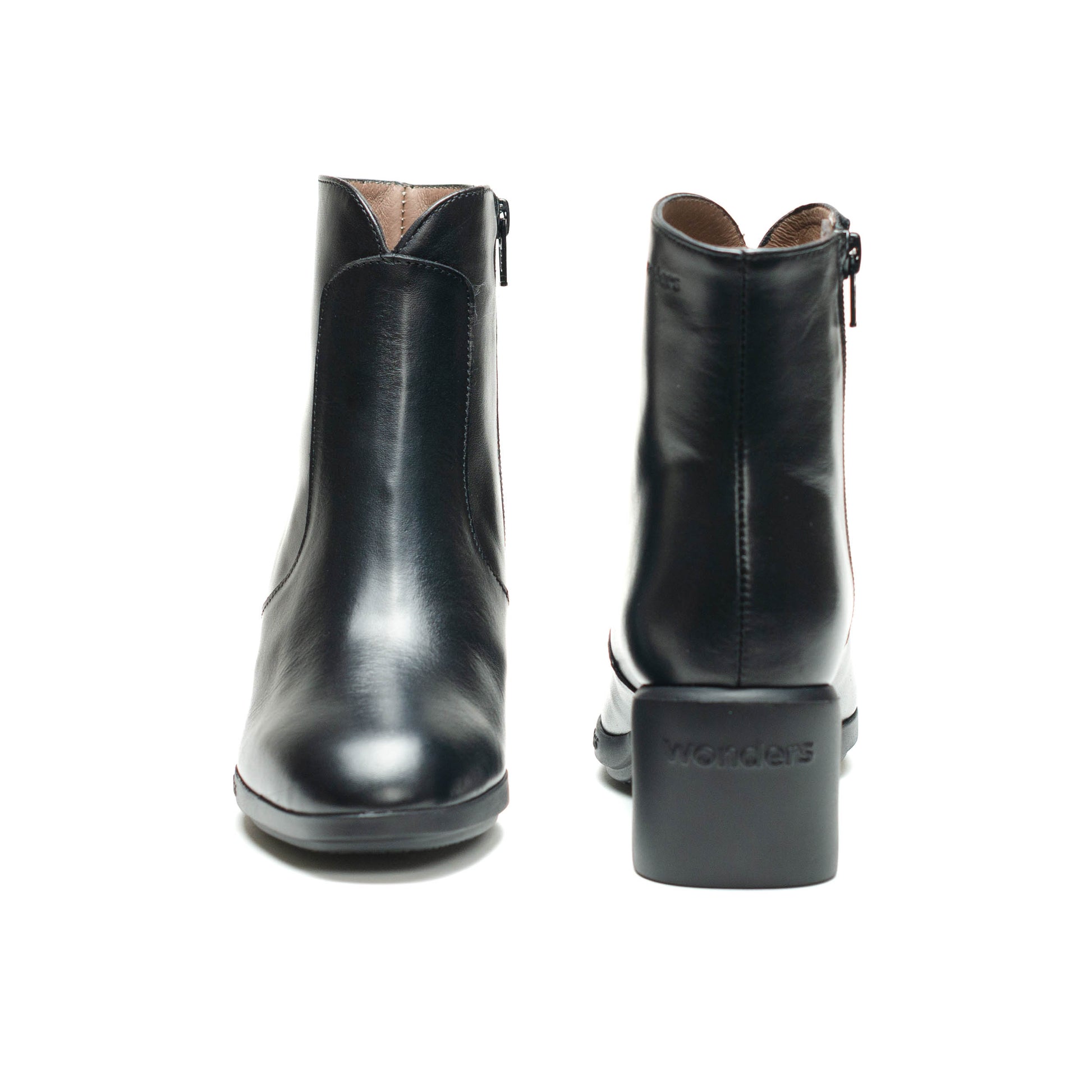 Wonders Escorpio, Botines REGHOST 05 confeccionados en piel lisa negra. El modelo REGHOST 05 tiene diseño minimalista y polivalente, destaca la parte frontal de la caña en forma de “V” y su cierre mediante cremallera lateral. Su nueva suela con tacón ha sido desarrollada con tecnología WondersFly™, que asegura una ligereza incomparable, mientras que la plantilla interior de MemoryGel garantiza comodidad en cada paso. Prepárate para la sensación #YesWeFly. Wonders apoya la fabricación responsable avalada por LEATHERWORKINGGROUP.