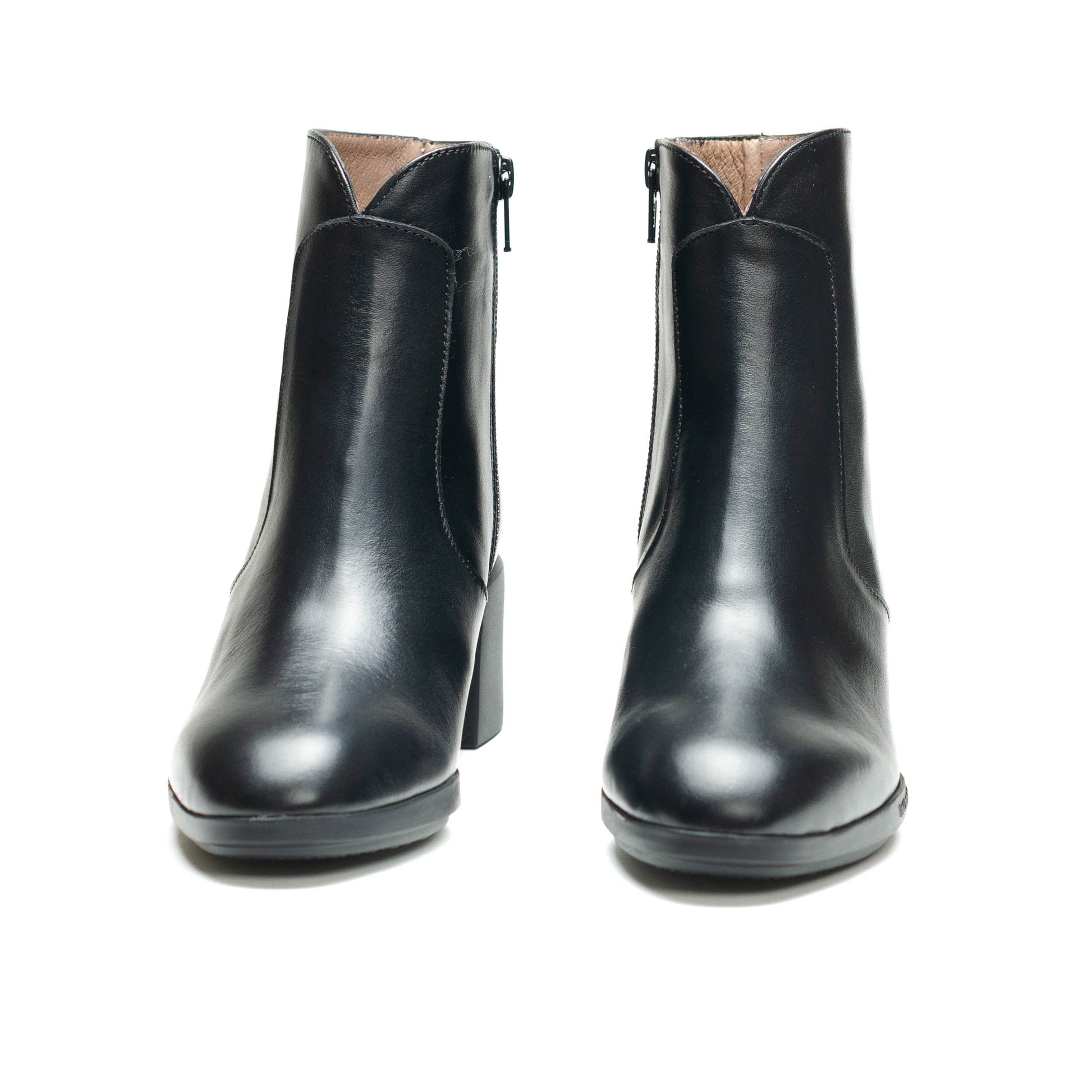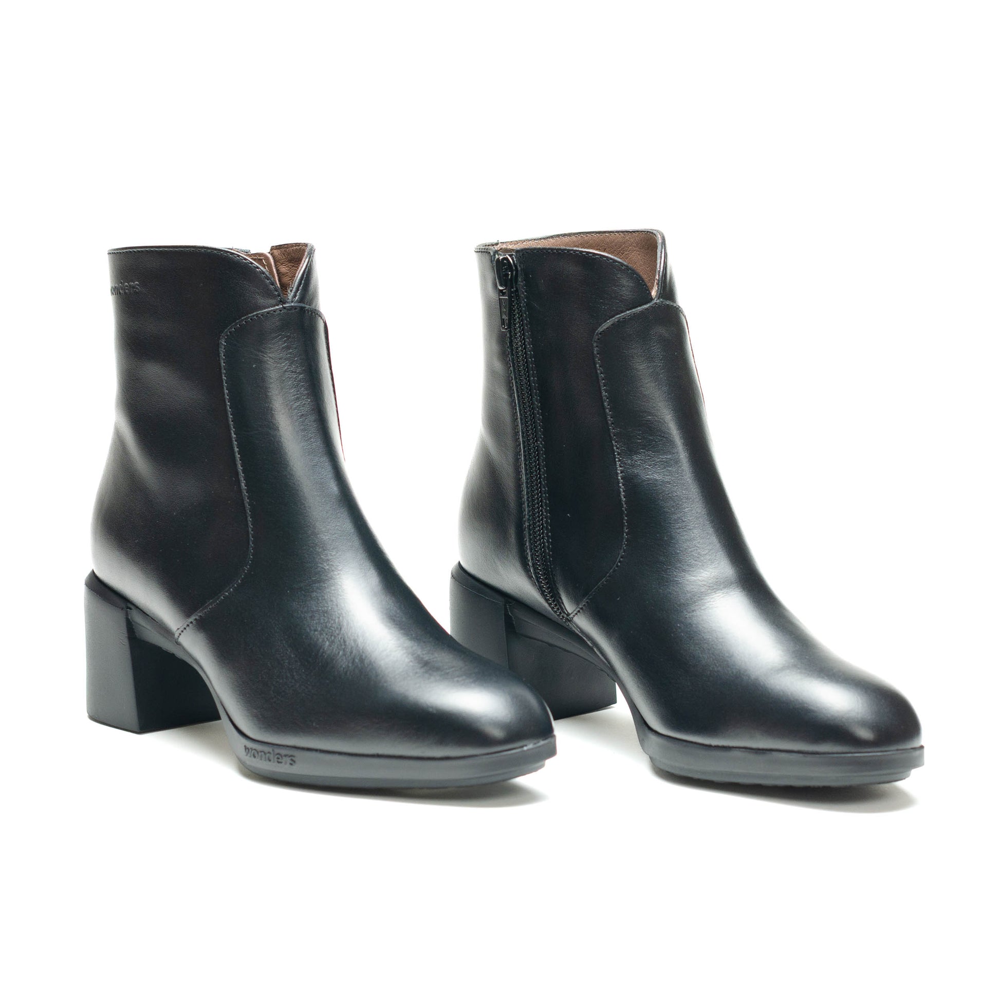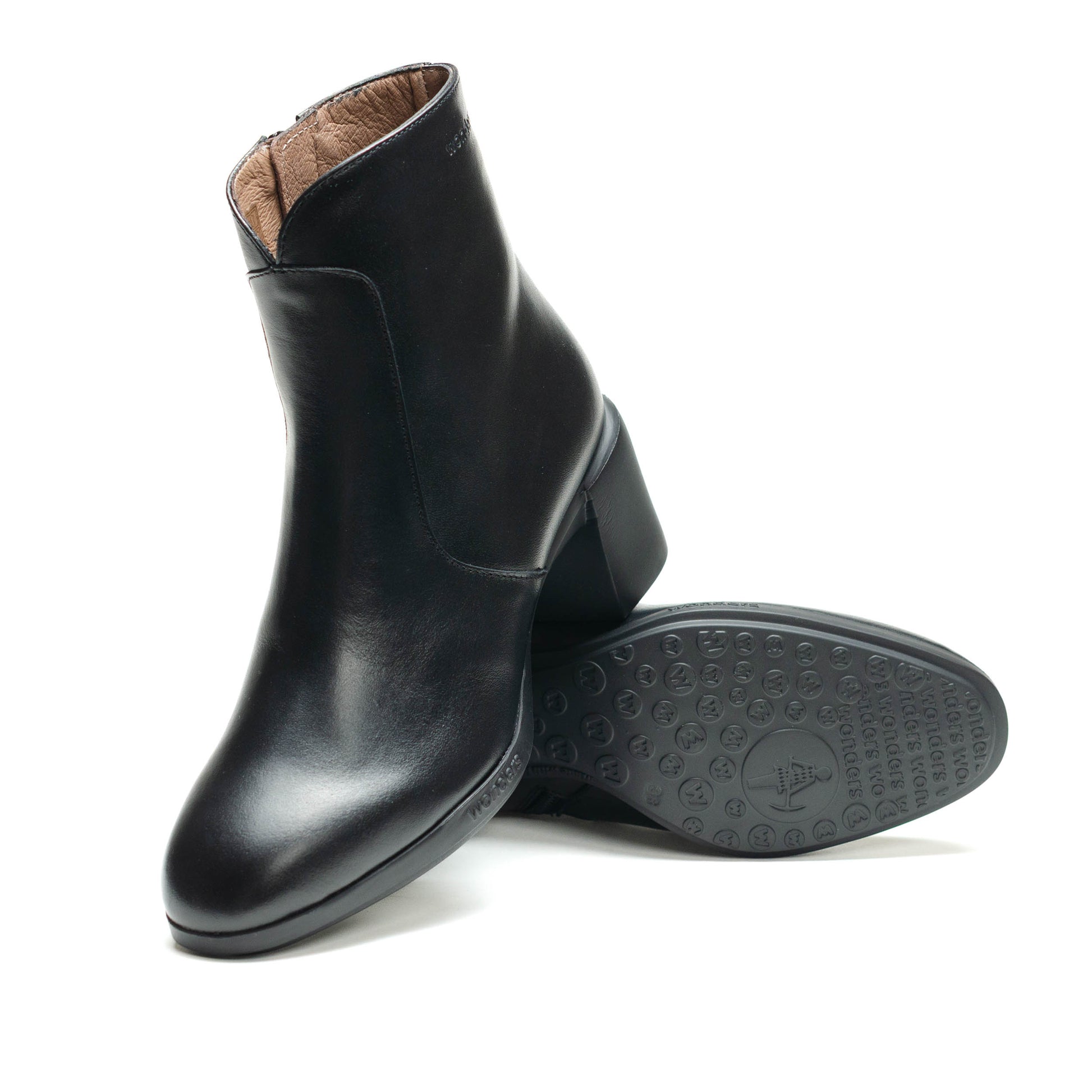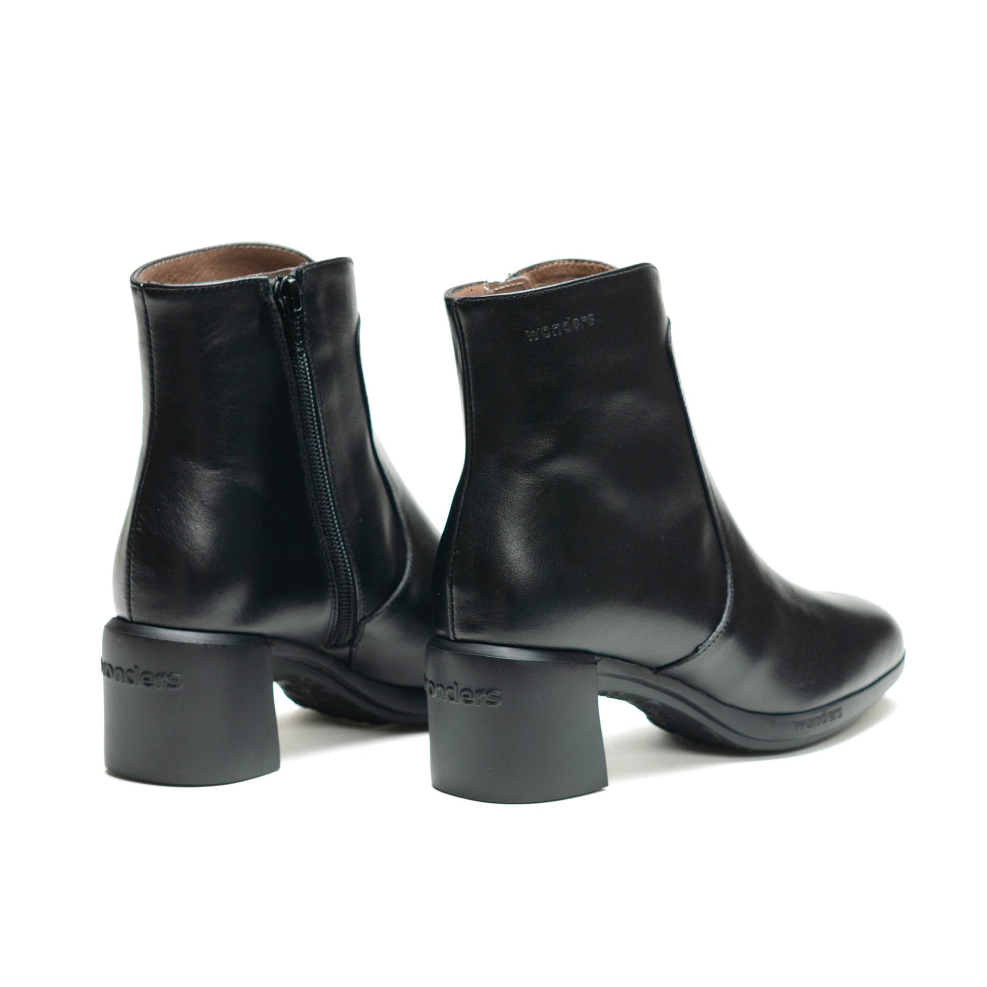 Wonders Escorpio, Botines REGHOST 05 confeccionados en piel lisa negra. El modelo REGHOST 05 tiene diseño minimalista y polivalente, destaca la parte frontal de la caña en forma de “V” y su cierre mediante cremallera lateral. Su nueva suela con tacón ha sido desarrollada con tecnología WondersFly™, que asegura una ligereza incomparable, mientras que la plantilla interior de MemoryGel garantiza comodidad en cada paso. Prepárate para la sensación #YesWeFly. Wonders apoya la fabricación responsable avalada por LEATHERWORKINGGROUP.