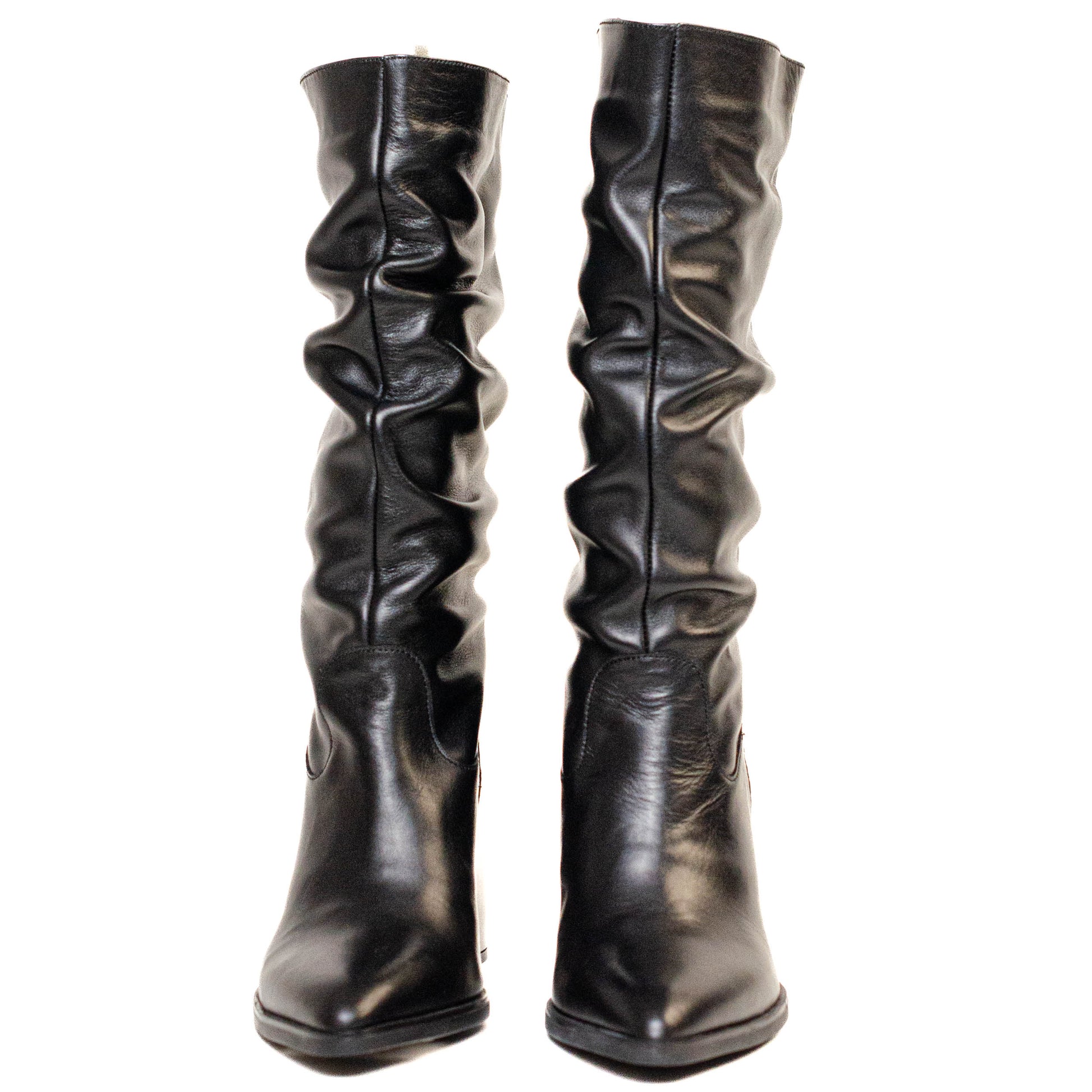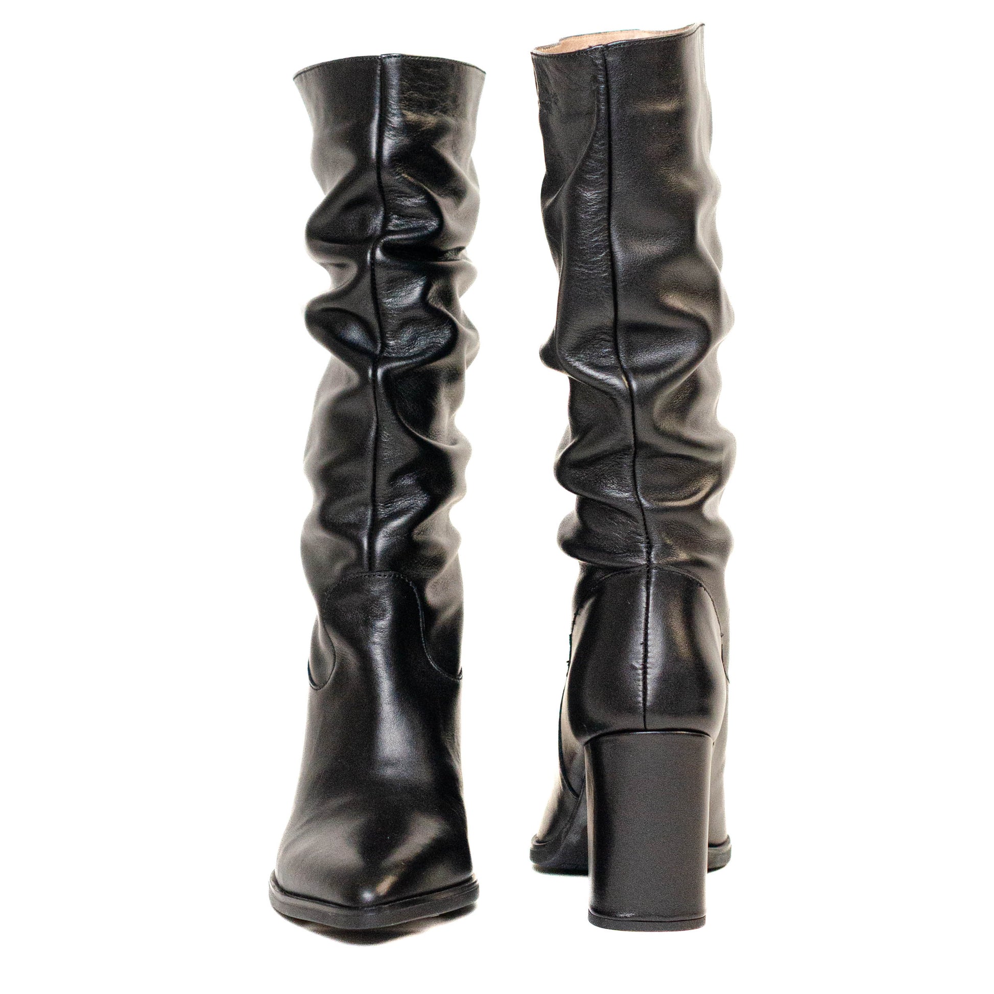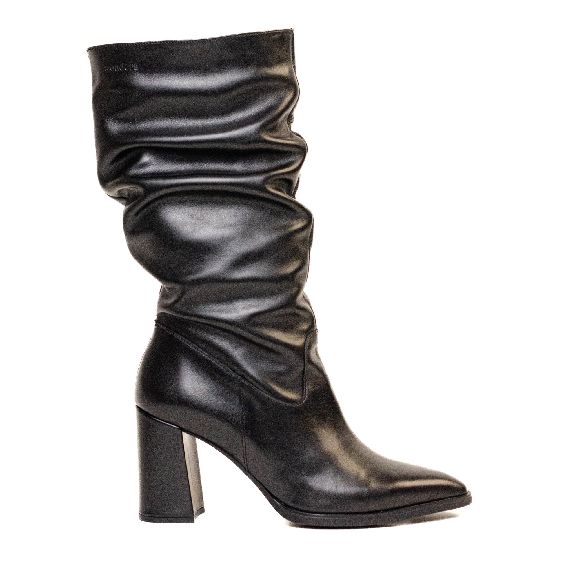 Wonders Escorpio. Botas altas confeccionadas en efecto arrugado. Diseño de punta ligeramente fina y tacón ancho para aumentar la comodidad. Queda genial con faldas y vestidos vaporosos.